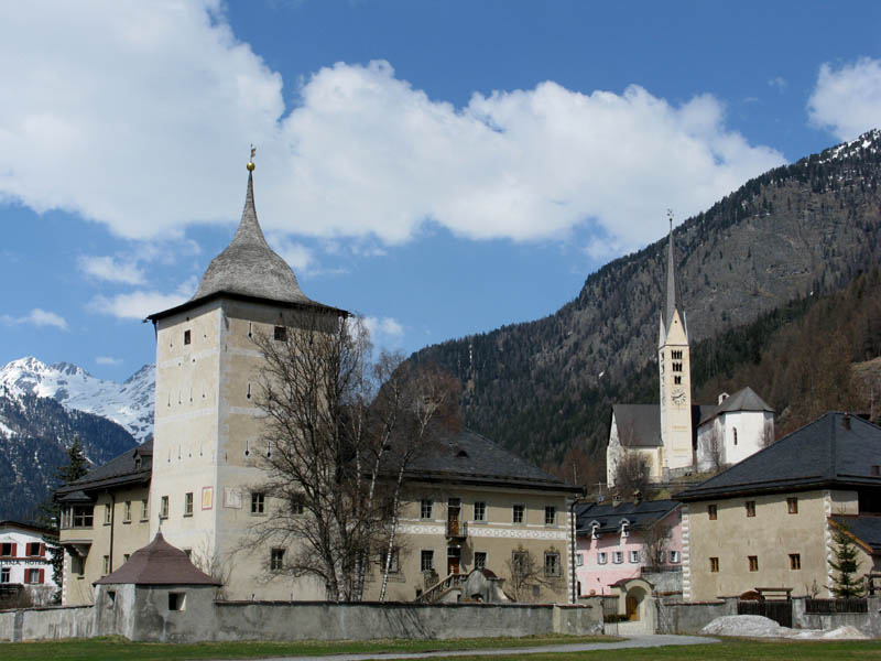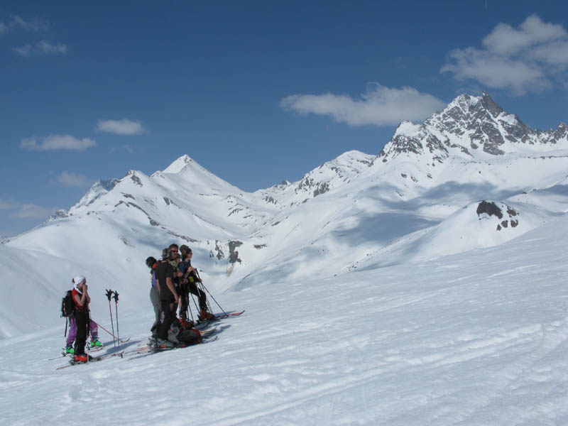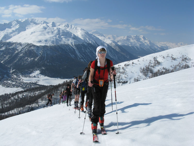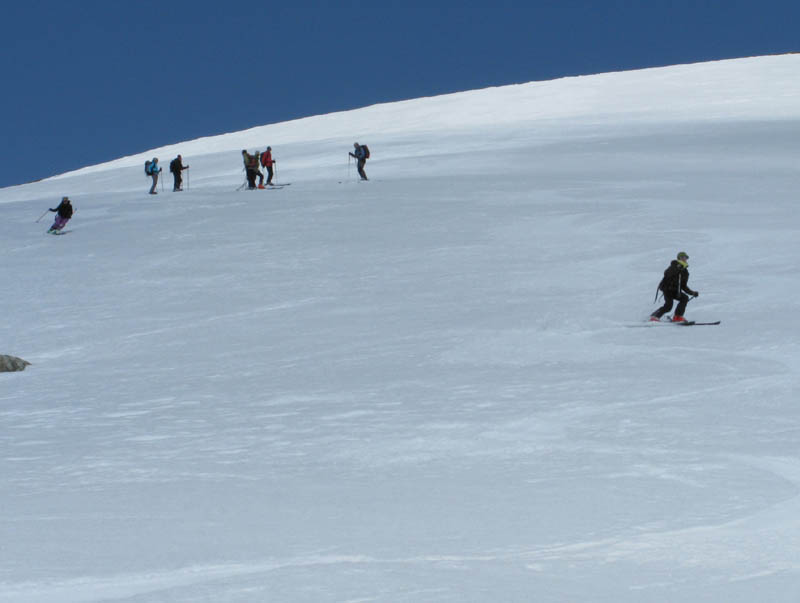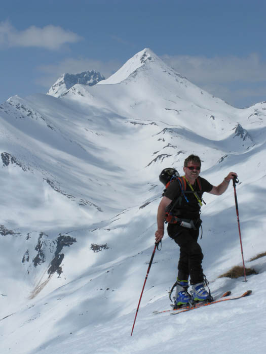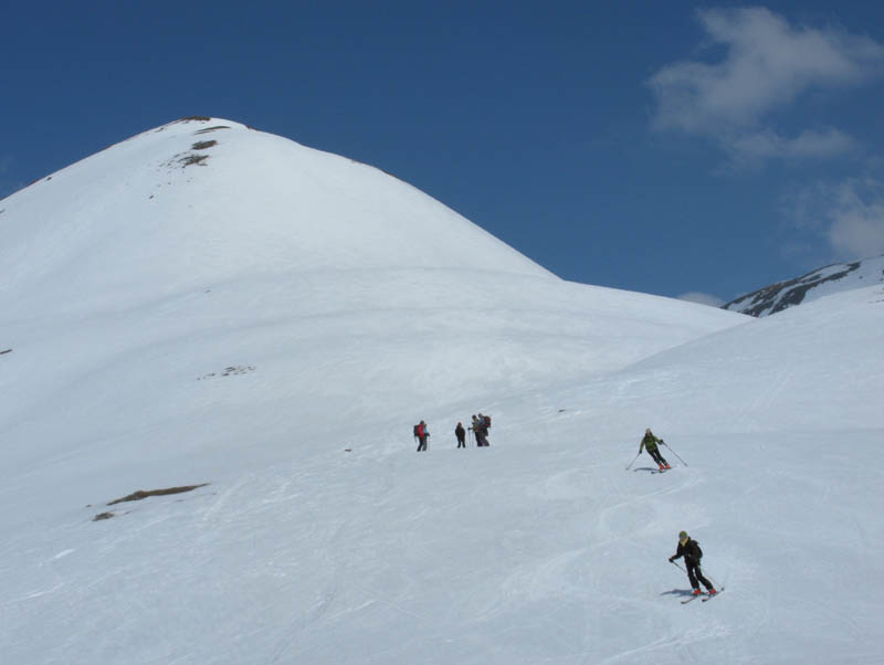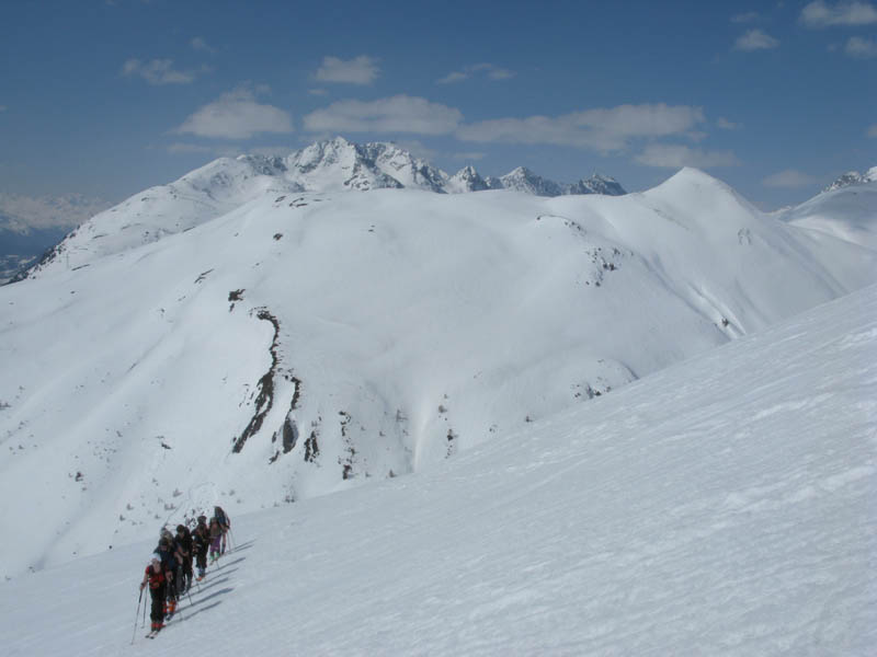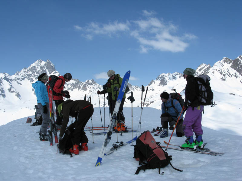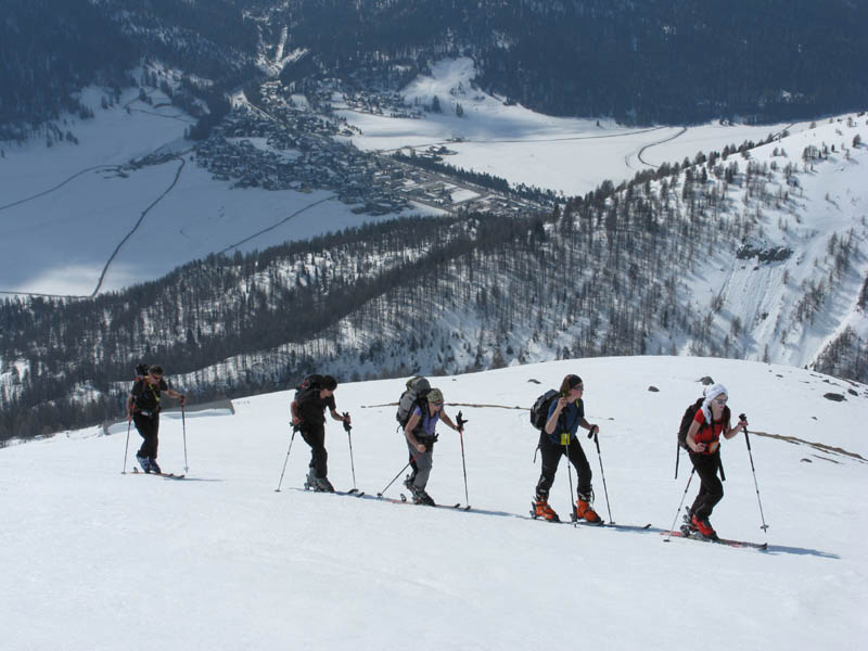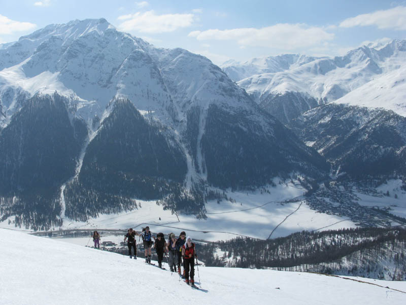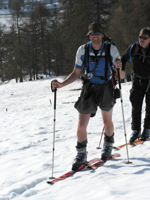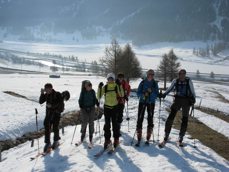 Von hinten grüßt der alte Bekannte Piz Blaisun und bald waren wir vollzählig am Gipfel versammelt. Auch der Schnee hielt bei der Abfahrt bis weit in den Lärchenwald hinunter, ganz unten brach er dann teilweise, was dem Autor eine Beteiligung bei der Sturzkasse einbrachte und dem Rest eine Strafgebühr für defensives Abfahren auf dem Ziehweg.