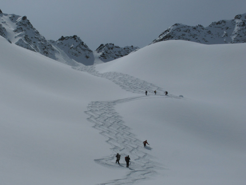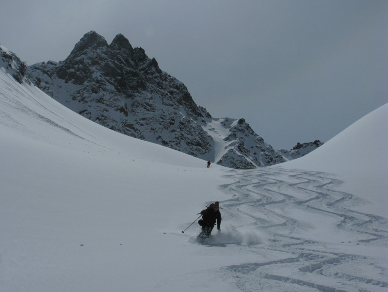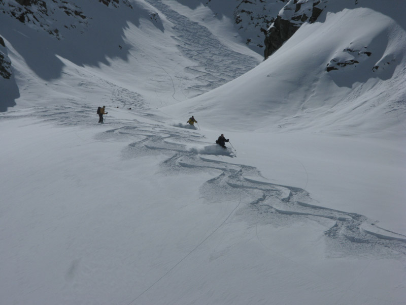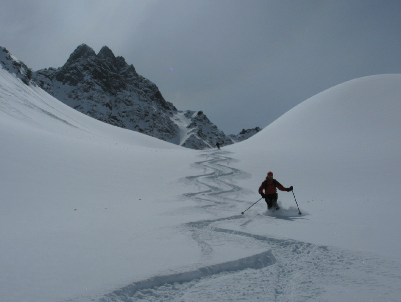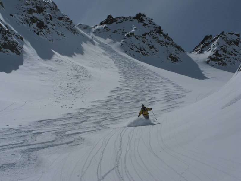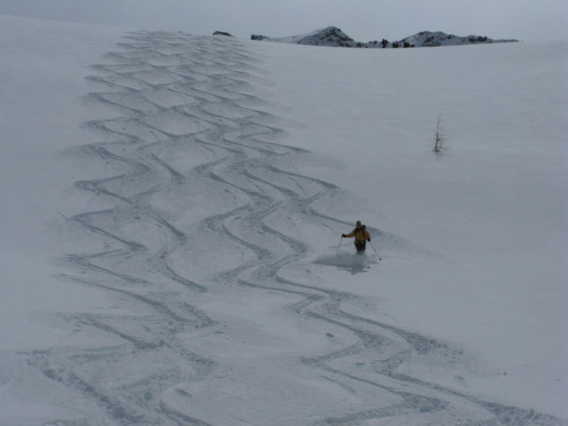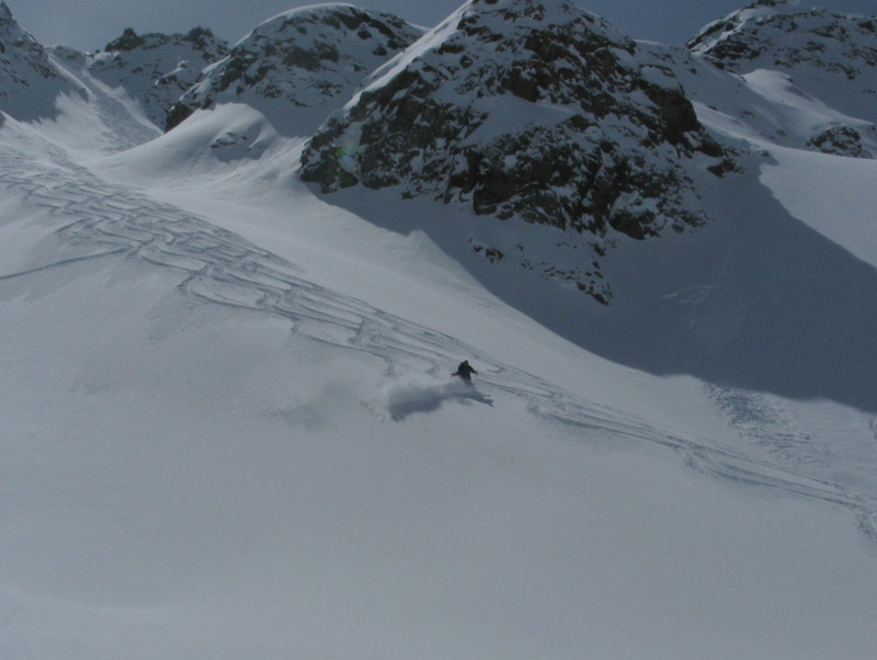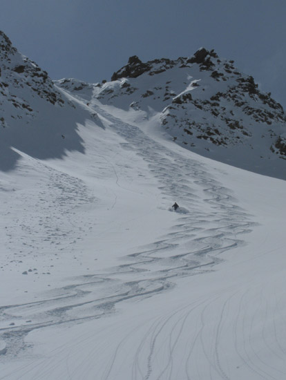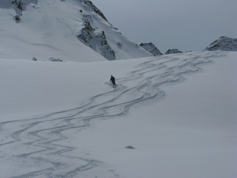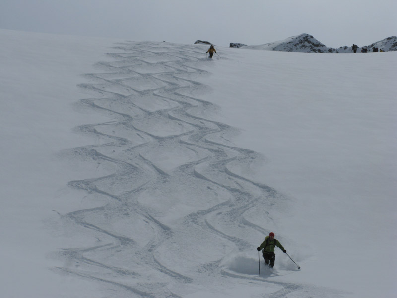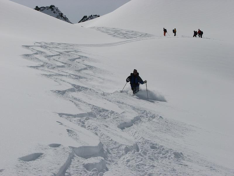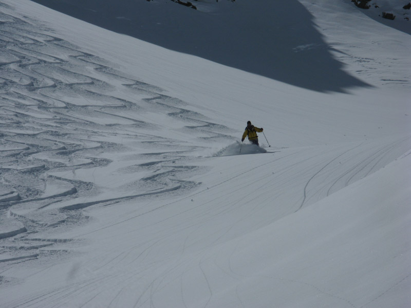 Nur die ersten Schwünge waren etwas holprig durch Bollenunterlage - dann gings wunderbar raus - und viel solche Hänge folgen - zuerst ca 30cm Auflage, dann langsam weniger, aber fast immer locker und leicht..