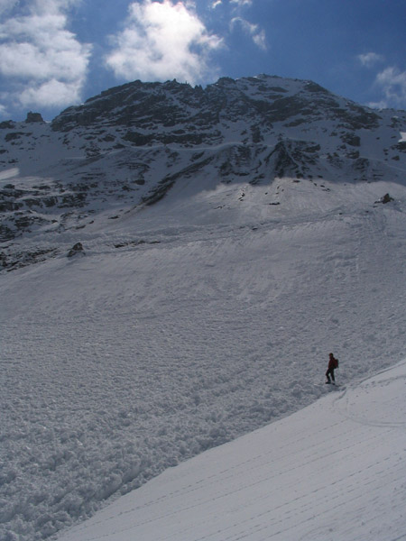 Die Selbstauslösung zu diesem Zeitpunkt ist mir rätselhaft (zum gleichen zeitpunkt wurden in ähnlichen Hangexpositionen am Laschadurella (1km entfernt) sehr steile Abschnitte abseits der "normalen" Route befahren, entlang eines Rückens war dort entweder ganz wenig Schnee oder einigermaßen kompakter Untergrund) und zeigt einem wieder mal eindrücklich, dass man das Thema nicht richtig im Griff hat.