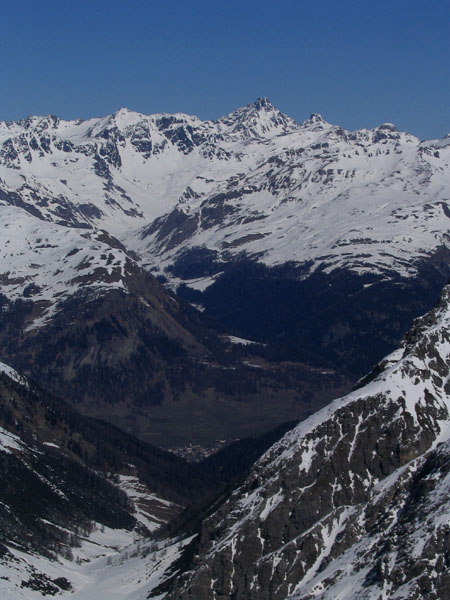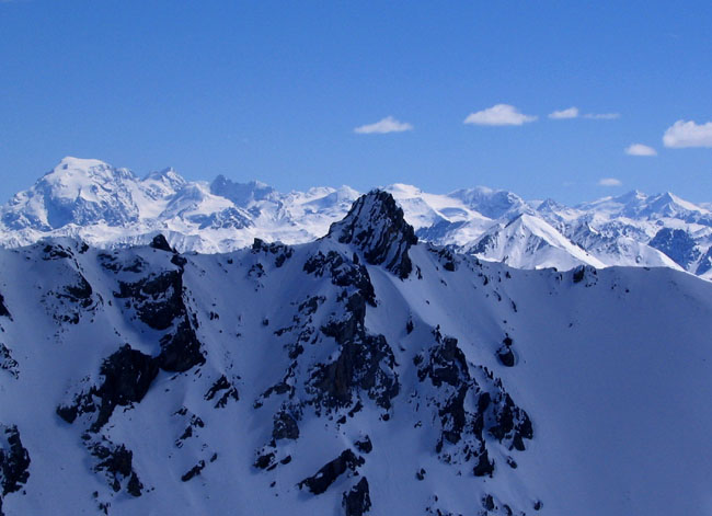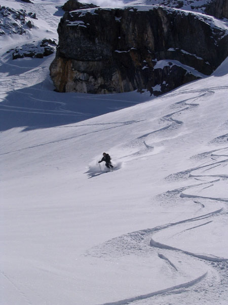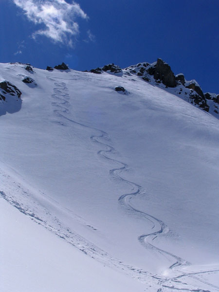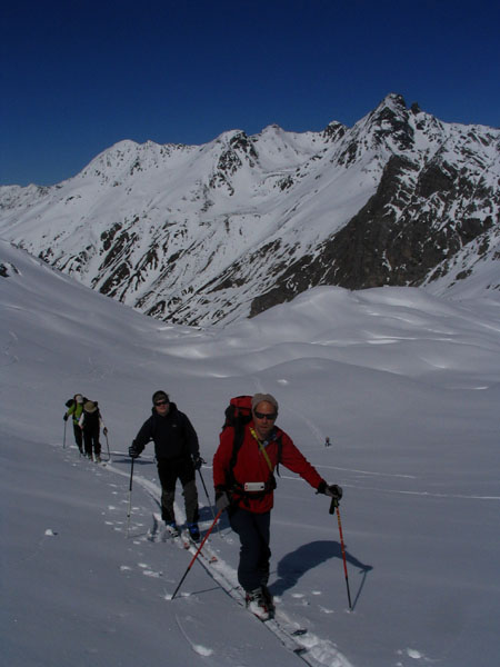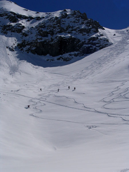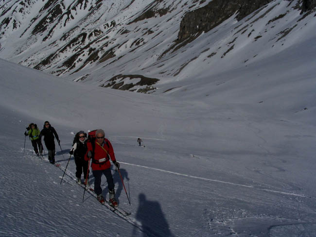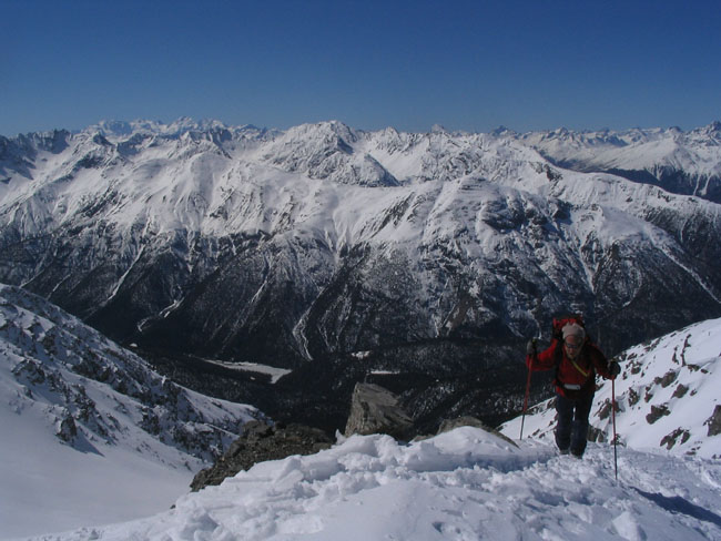 Meine Gruppe zog nach dem Maßenstart von der Alp Laschadurella weiter über die sanften Hänge ins hintere Tal, wo uns dann der steile Gipfelhang zur Scharte des Piz Laschadurella erwartete. Eine Power- steil Spur entschärften wir hinauf zu Scharte, dann genossen wir den Blick zur Bernina. Arthur begleitete mich den steilen Rücken vollends zum Skigipfel hinauf. Nach dem Schartenhang mit Pulver und oben ein paar versteckten Steinen, unternahm ich noch eine kleine Exkursion zur Schneedeckenuntersuchung zum Grat weiter westlich- Ergebnis: gesetzter Pulver, in Mulden auf scheinbar stabiler Unterlage, dazu ein paar von oben eingestreute Züricher (die oben ziemlich wild herübergequert waren).