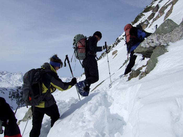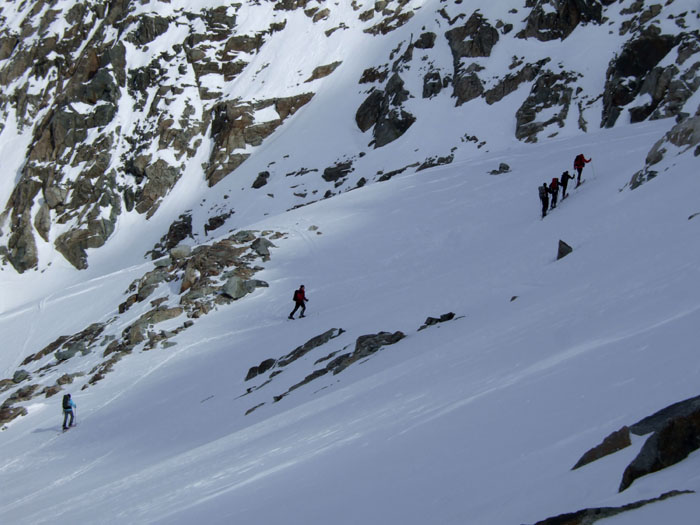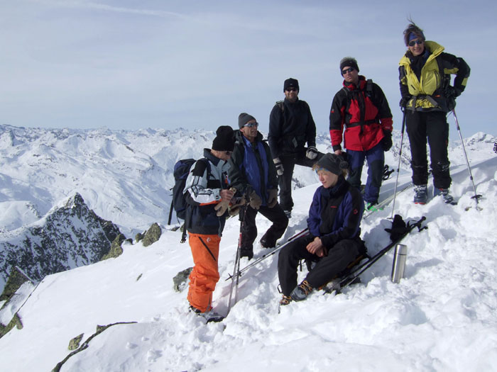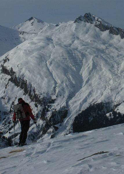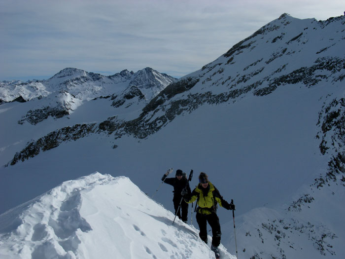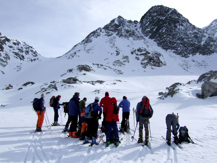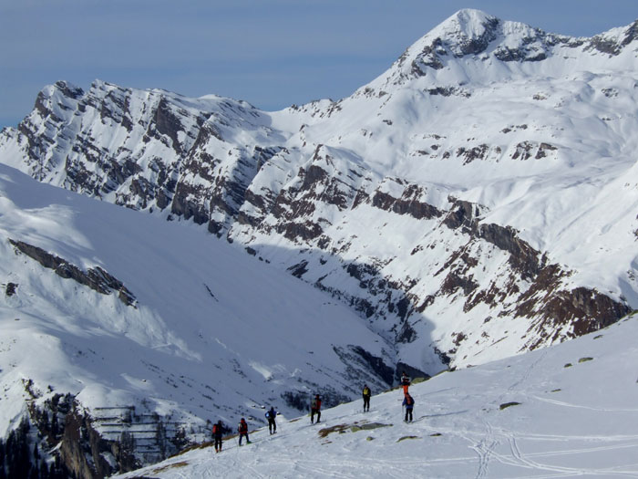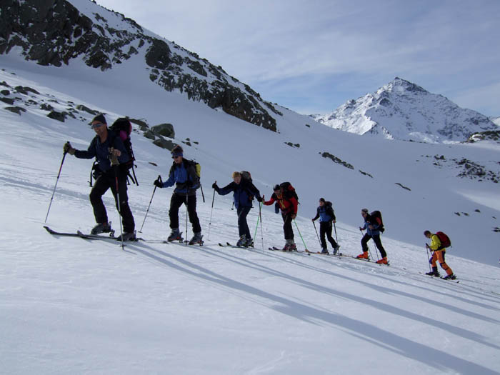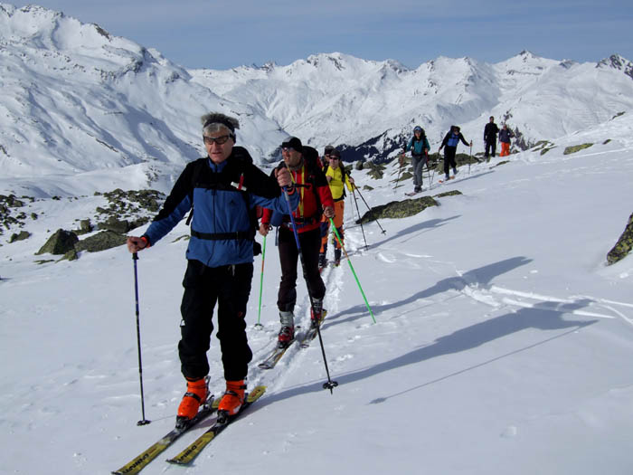 Da südostseitiges Gelände schon genügend getestet war, ein Versuch auf die zwar windbearbeitete, aber dafür wenigstens im unteren Vereich pulverträchtige Nordseite. Mit den Samstag- Morgen Nachzüglern waren wir auf 19 Personen gewachsen, als wir uns über einen gemütlichen Ziehweg von Splügen durch den Dreuschwald Richtung Schwarzhörner aufmachten. Trotz dieser Riesenhorde ging alles erstaunlich entspannt, reibungslos und relativ flüssig vonstatten, oder werde ich nur langsam altersgeduldig? Nach der Waldgrenze wurde der Schnee dann zwar bald windgepresst, aber dafür bot das Gelände gut begehbare und abwechslungsreiche Mulden und Stufen, die uns dann unter die Surettalücke führten. Hier gab es eine kleine Aufteilung, während ein Trupp die untere Lücke als Ziel wählte, nahm die andere Hälfte ein kleinen Steilhang, der den Zugang in die Scharte am Nordgrat des Surettahorns ermöglicht. Von dort aus gab es noch eine kleine Schneestapf- Einlage am Gipfelaufbau des vorgelagerten Punkt 2932.