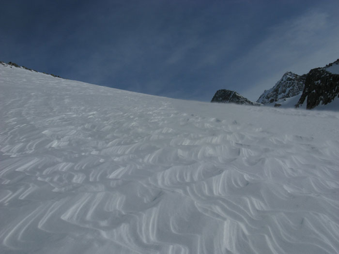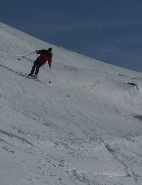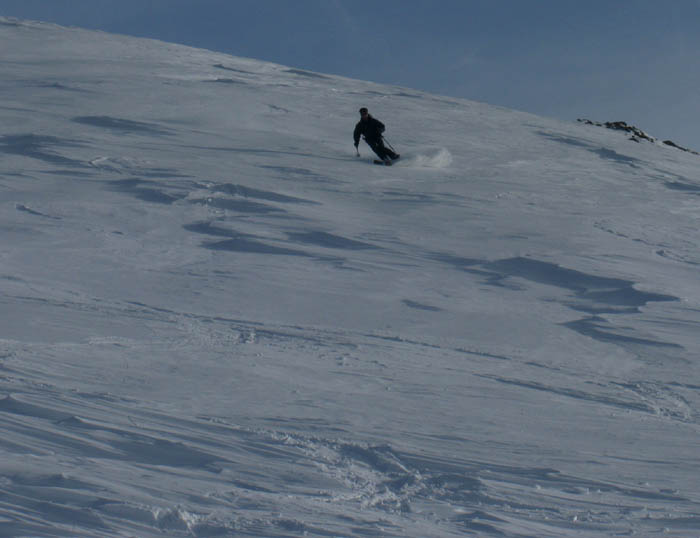 Die Gruppe von der unteren Scharte hatte damit etwas an Vorsprung, und nach den gleichmäßig festen und damit gut fahrbaren, oberen Mulden stürzten sie sich gleich gerade hinunter in das Tal des Splügenpasses, wo noch einige unverblasene Pulverhänge begeisterten, bevor es dann über die Piste zum Ausgangsort zurückging.