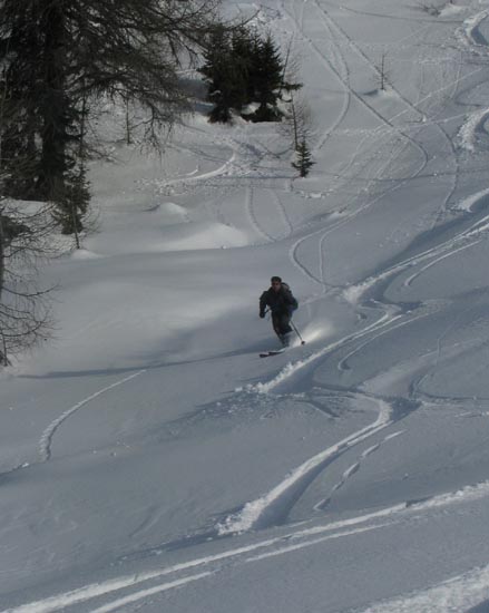 Die Gruppe auf den PKt 2923 zog auf der Terasse wieder nach Nordosten hinaus, um dann ab der Waldgrenze über mehrere Pulverhänge und einen zwischengelagerten schmalen Waldrücken direkt von oben die wunderbaren Pulverwiesen direkt überm Parkplatz zu erreichen. Danach gab´s dann noch verschiedentlich eine Einkehr im schnuckeligen Cafe, wo der Jean wundersamerweise zum großen Teeliebhaber mutierte.