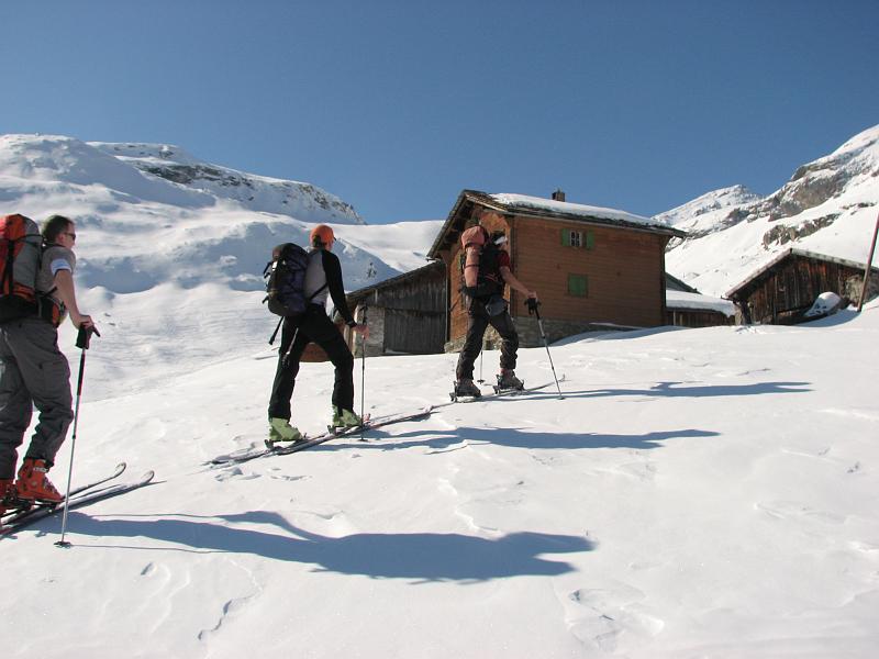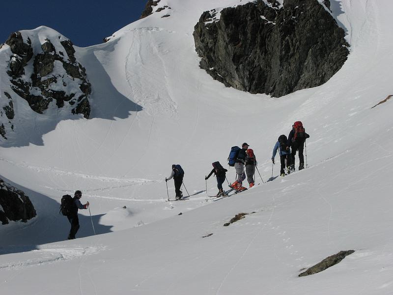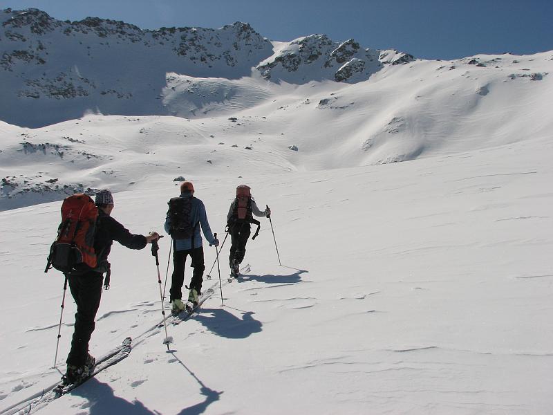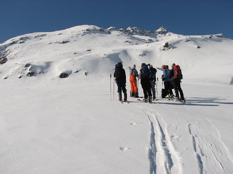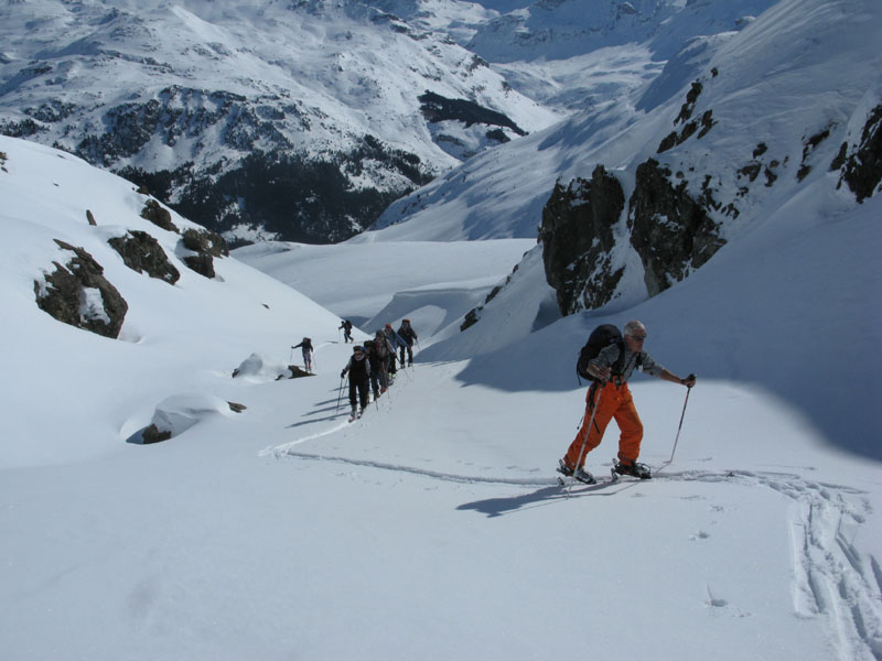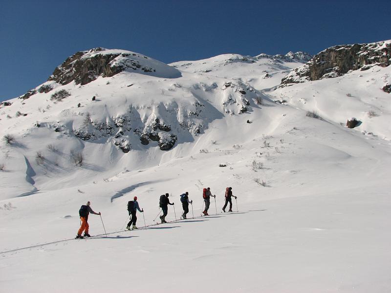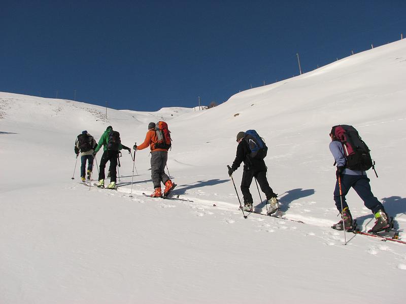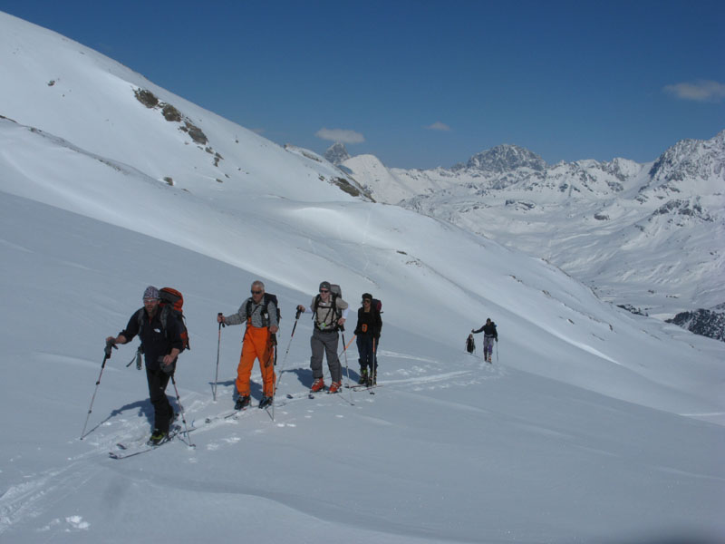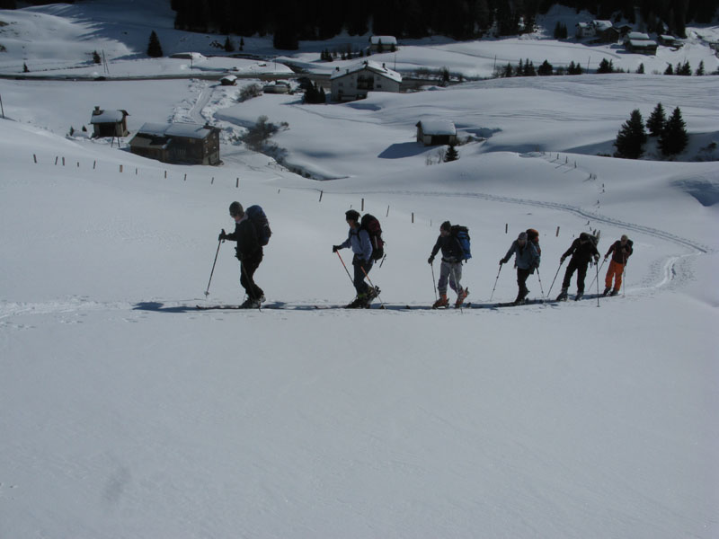 Wir hatten Lust, ein vom Sonntagansturm verschontes Skitourengelände aufzusuchen und unsere Wahl fiel auf die Gegend nördlich des Piz Scalotta mit ein paar namenlosen Gipfeln über einem mit Seen bedecktem Hochkar. So verteilten sich am Mo morgen die verbliebenen 10 Leute auf 3 Autos und steuerten den Parkplatz bei der Werkstatt unterhalb Sur Ragn an. Von dort zogen wir unsere Spur über unberührte Hänge vorbei an den beiden Sommersiedlungen auf eine Felswand zu. Die Rinne, die uns weiter darauf hinführte, überzeugte von der Pulverschneeoptik, hatte aber teilweise sehr hohlen Unterbau der Schneedecke, was mir im Anbetracht der oberhalb zu erwartenden Stufe etwas Bauchschmerzen bereitete. Nach einer knappen Stunde verließen wir dann die Rinne nach links und konnten bei einer Drinkpause die Optionen für die Steilstufe erstmals richtig einsehen. Viel besser gefiel uns allerdings die Fortsetzung unserer Rinne durch ein kleines felsgesäumtes Tal, das zwar schmal, aber ohne ernsthaftes Hindernis den Weg in das Plateau unter den Nordhängen des Piz Surpare eröffnete.