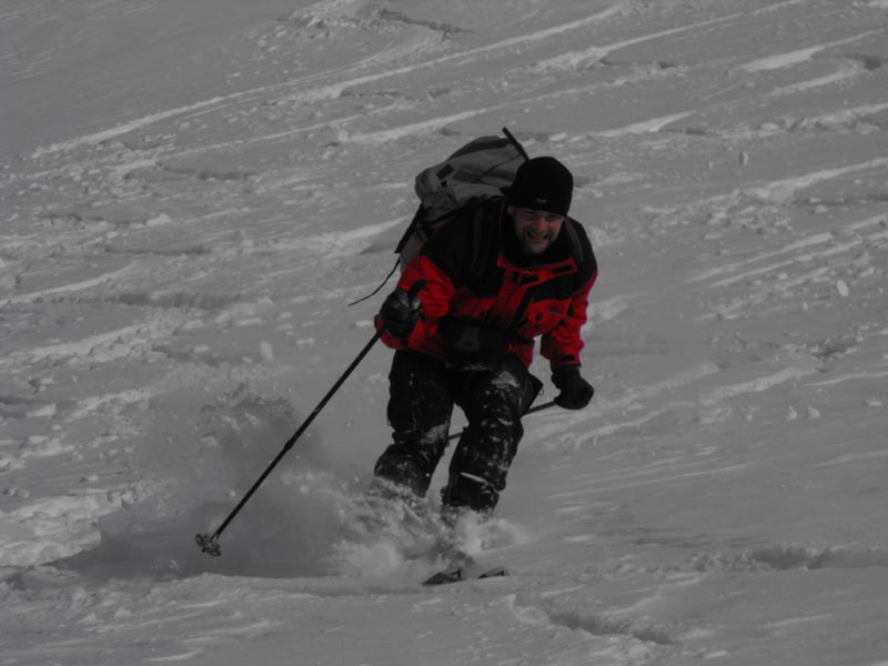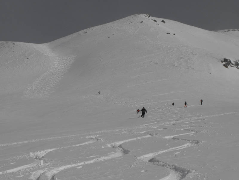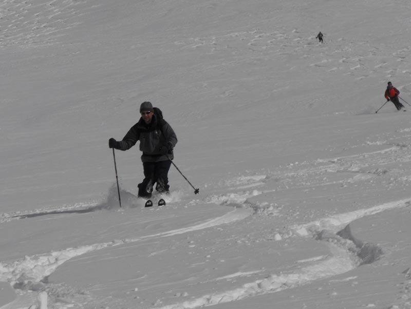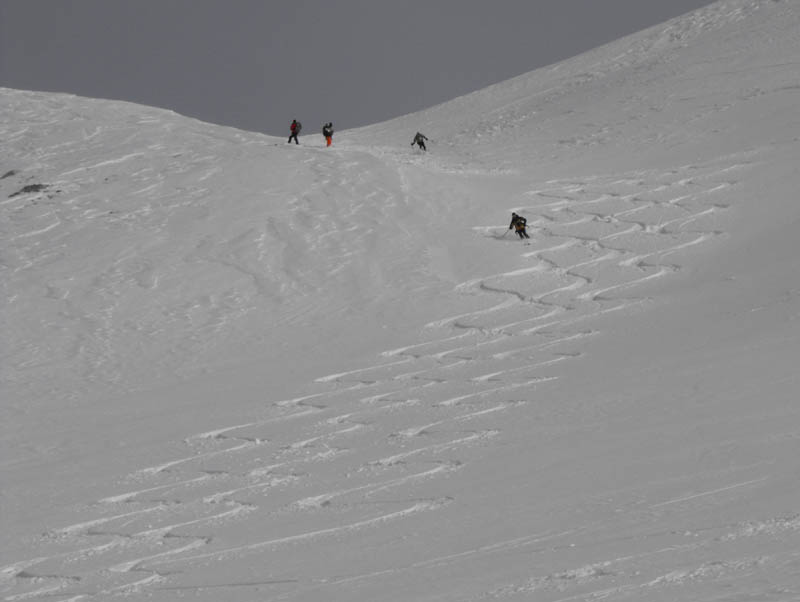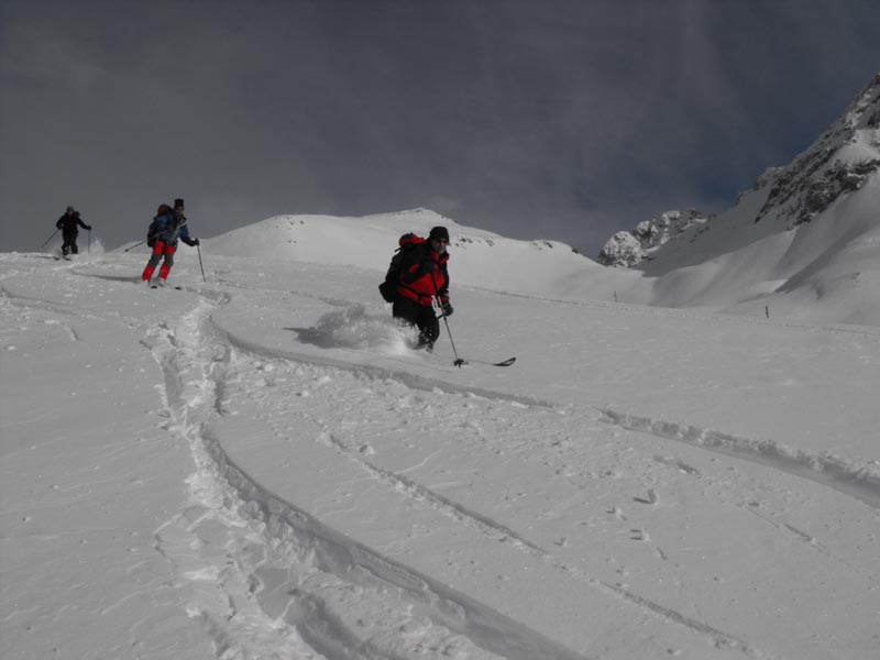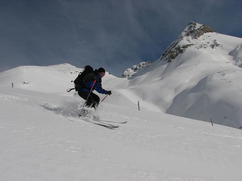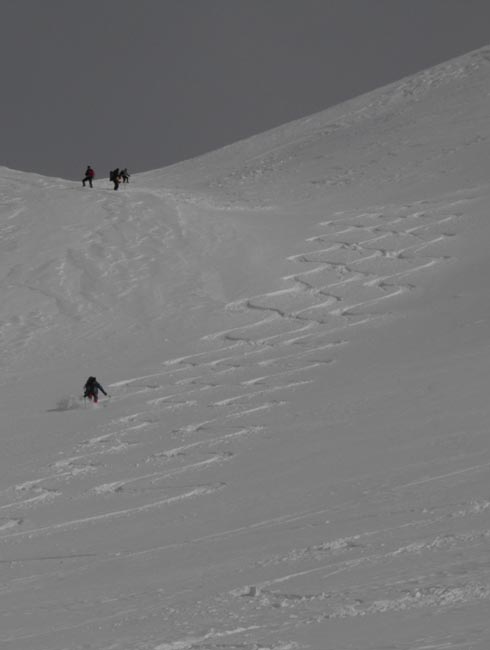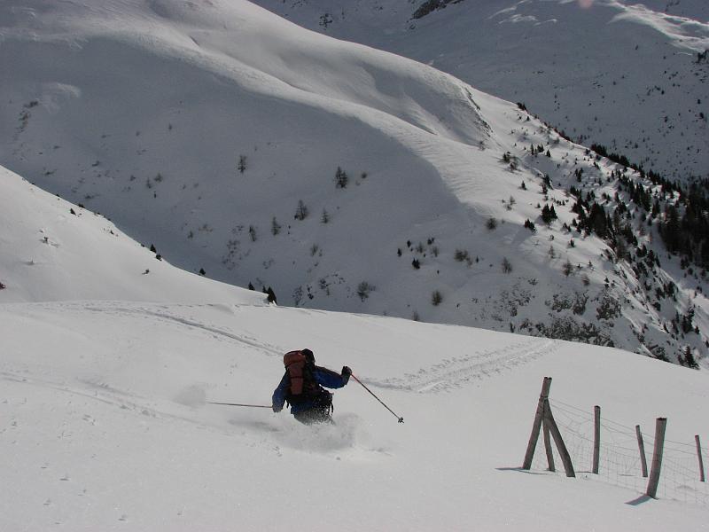 Für die Abfaht kam gleich nach den ersten Gratsrücken die Sonne wieder raus. Wir tasteten uns über die Rampe an die steilere Mulde, die wir dann einzeln befuhren. Der eine oder andere kam ganz schön ins Schnaufen, so an die 50 Schwünge in nicht ganz federleichtem Schnee am Stück durchzuziehen. Danach folgten weite, flacher Hänge und der Rücken neben der Lawinenverbauung, alles sehr genußreich