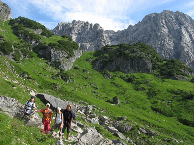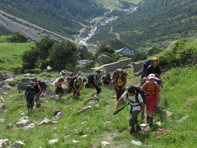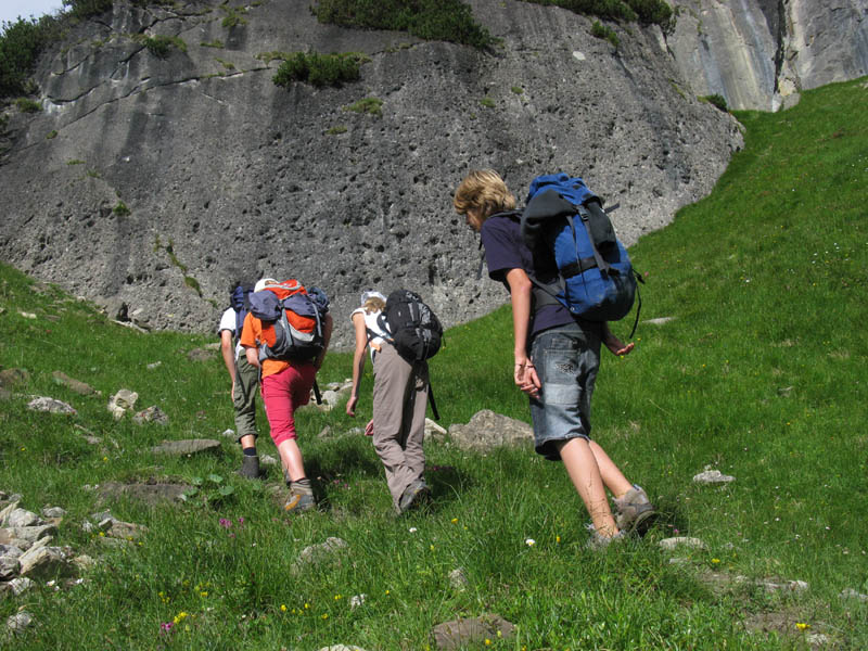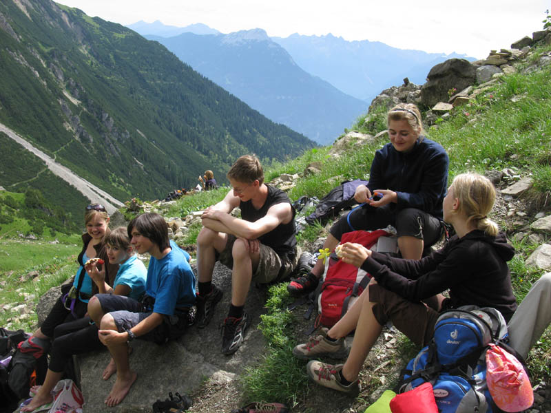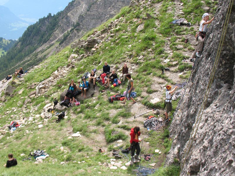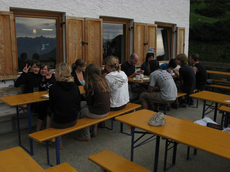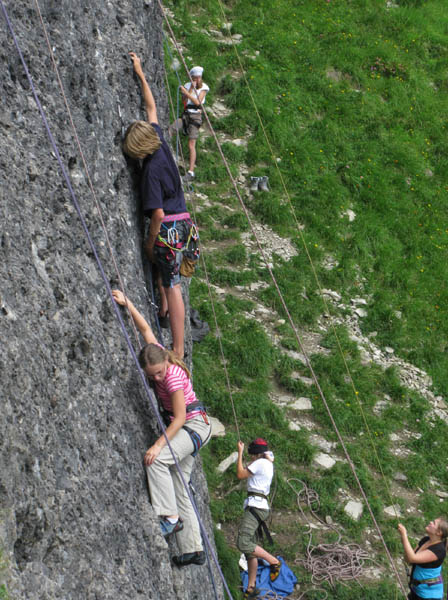 Irgendwie müssen sie dann doch alle eingeschlafen sein, wenigstens haben spätestens beim Wecken um halbacht morgens dann alle geratzt. Erstaunlich gut kommen dann aber alle relativ flott aus den Federn (bzw Daunen oder Wolldecken). Da die Sonne schon lacht, wird auch das Frühstücksbüffet auf der Terasse verputzt. Zum heutigen Zielfelsen ist es auch nicht weit, für Julia und Katherina offensichlich viel zu kurz, denn sie legen den weg 2 mal zurück.