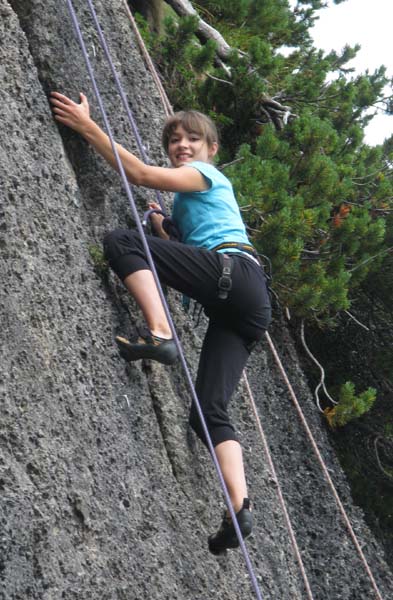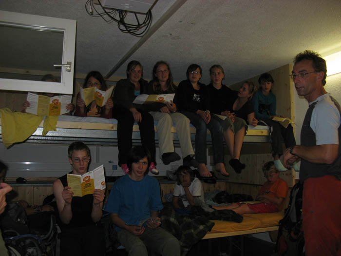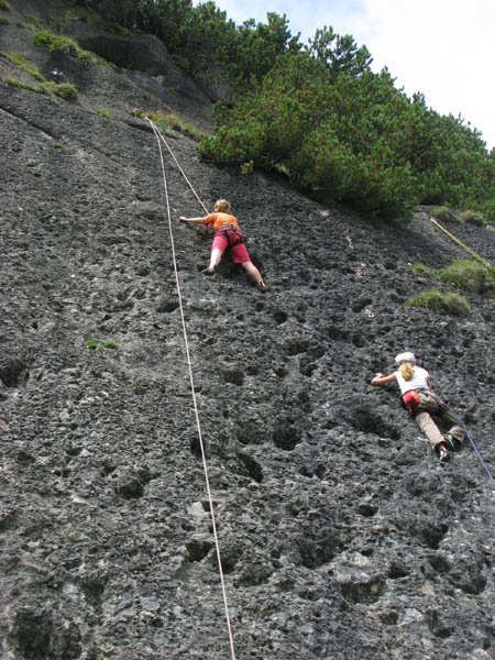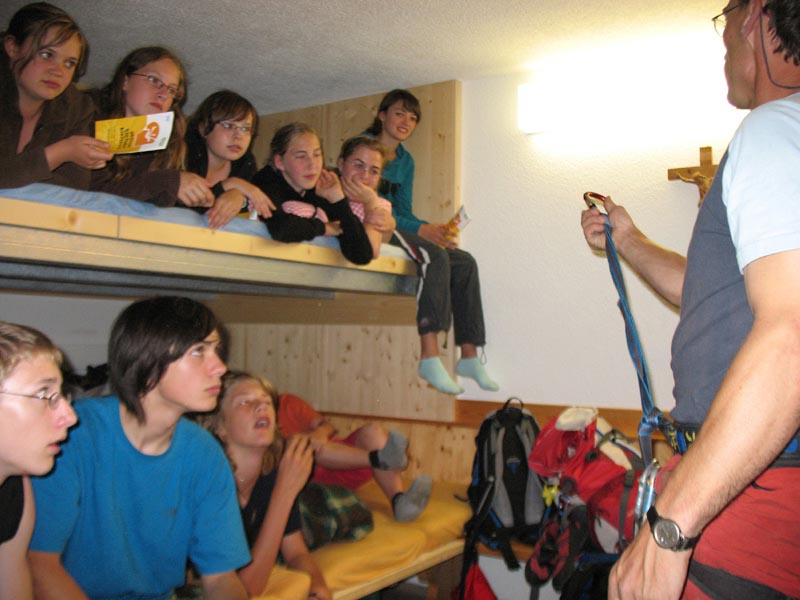 oben - im Sektor Eisenhut gibt´s dann etwas härtere Kost. Es reichte aber gerade noch für 3 Touren, dann geordneter Rückzug zur Hütte, bevor die ersten Regentropfen einschlugen. Nach 2 Stunden gemütlichem Spätnachmittags-Chillen auf der Hütte hatte es schon wieder aufgehört, ein paar sportliche zogen noch per Expresswanderung bis fast rauf zum Muttekopf. Dann kam der nächste Schauer, so dass nach dem Abendessen eine theoretische Nachbereitung bzw Vorbereitung für den “Kletterschein”´ dann im Lager- Seminarraum durchgeführt wurde, statt auf der Terasse: Der folgende gemütliche Teil fiel diesmal schon etwas gedämfter und kürzer ausfiel