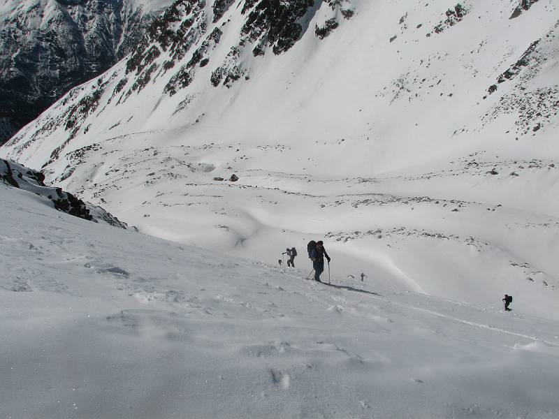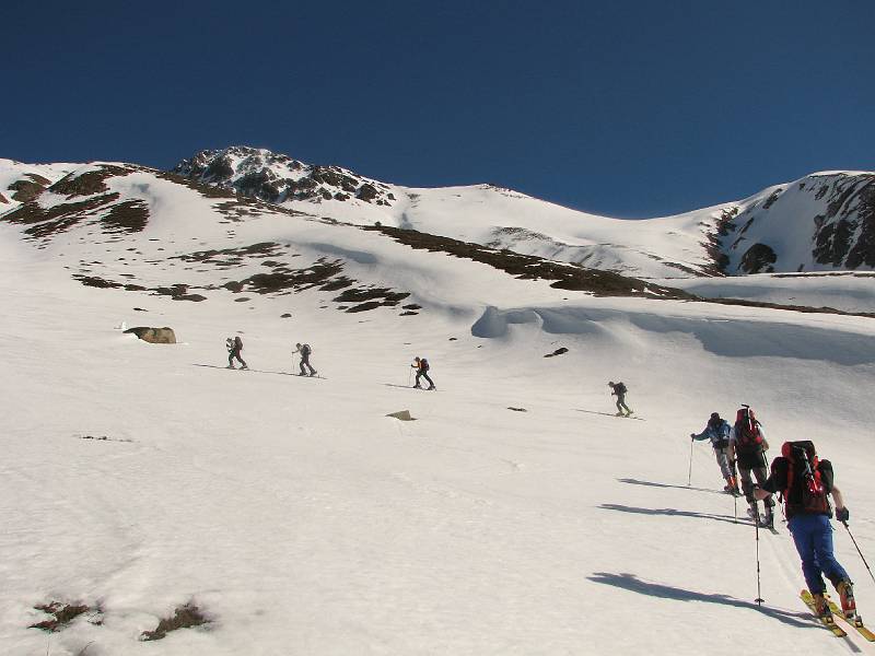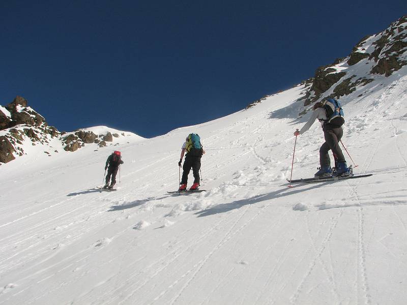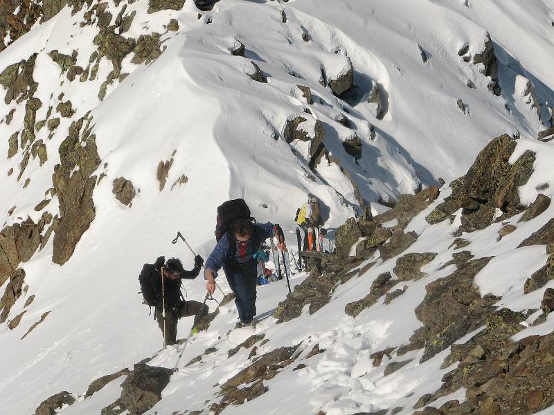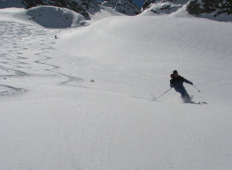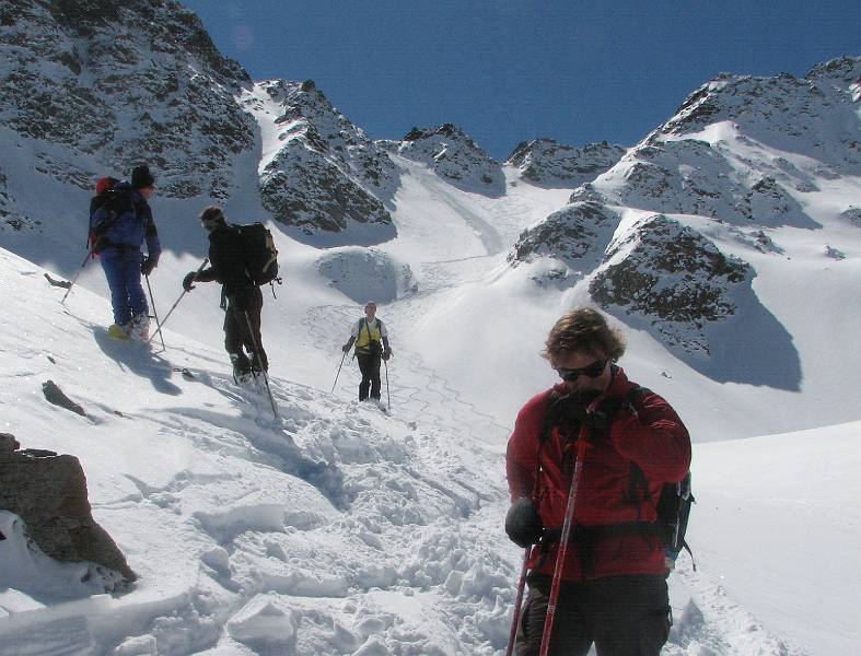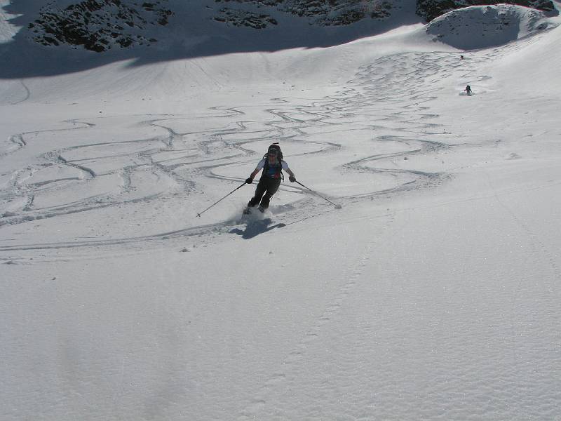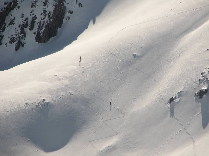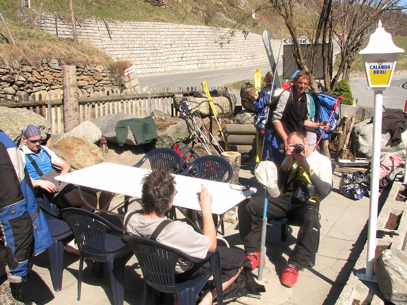 Karfreitag Piz Nuna: bei der Herfahrt am Donnerstag konnten ein erstaunlichgefüllte Schattenkare und ein Schneestreifen auf dem Fahrweg aus dem Val Nuna zum Inn bei Giarsun ausgemacht werden, also zogen beide Gruppen von der Ofenpassstraße zur Alp Laschadura, wo Mannis Truppe links abbog und die Schneeflecken im Südhang hinauf zur Nunascharte verband. Aufgehender Firn hätte auch zur Südabfahrt gereizt, doch nach dem steilen Schlusshang konnte dann die unverspurte Nordabfahrt deutlich mehr überzeugen. So blieb sogar noch Zeit, sich die Schnee und Schrofenhänge zum Gipfel hinaufzukämpfen, dann begann das Pulververgnügen. Weiter unten im Tal dann übergangsloser Wechsel zu Firn und so konnte es gut verschmerzt werden, dass das letzte Stück zum Ziehweg etwas schneearm ausgefallen war, und auch der Ziehweg ein paar Tragestellen aufwies. Höhepunkt dann die bestuhlte Terasse in der Wirtschaft zu Giarsun mit Calanda und Cappu, und so machte es gar nichts, dass der Abholer Bernhard einige Zeit verschollen war (die Ausrede mit eingehender Besichtigung von Guarda muss noch geprüft werden).