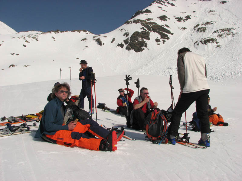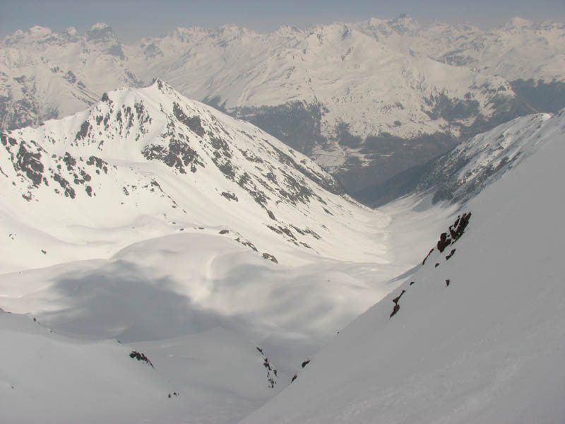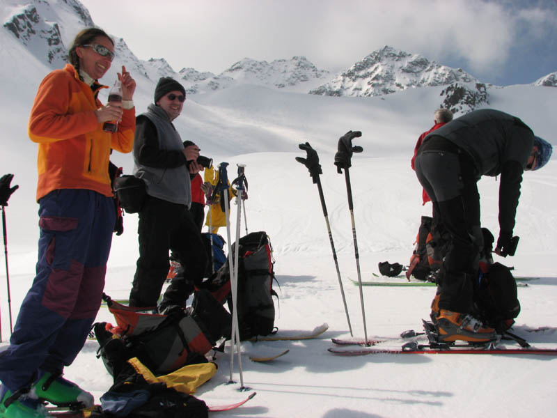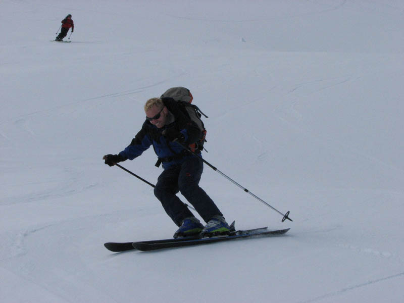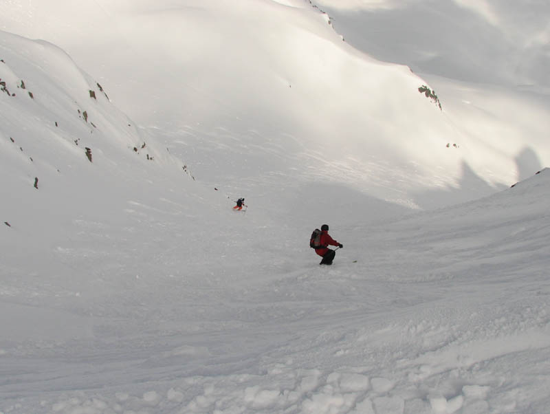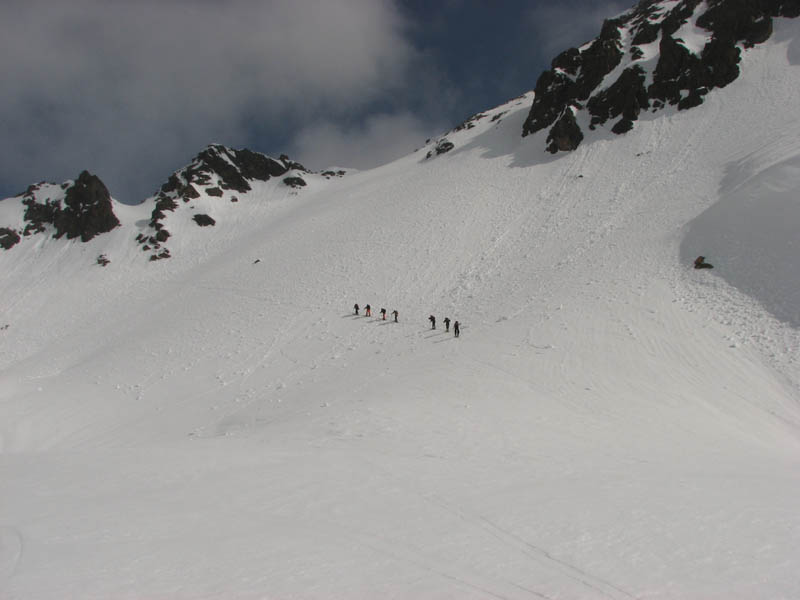 Die etwas angriffslustigere Abteilung wollte sich gleich mit Manni am ersten Tag eine Perle greifen und die Nuna Scharte überschreiten. Das VaL Laschadura war von einer großen Hochwinterlawine angenehm aufgefüllt, die großen Bollen der kürzlich abgegangenen mächtigen Gleitschneelawinen konnten leicht umgangen werden und dienten mehr dem Aufpeppen der Kullisse. Zwei Freitag- Morgen Nachzügler konnten sich gleich noch an die Fersen der Gruppe heften und so zogen doch 12 Personen bei angenehmen Verhältnissen die steileren Hänge hinauf Richtung Piz Nuna. Auch die 2 oberen Steilstufen waren gut begehbar und hätten sicher auch angenehme Firnverhältnisse hergegeben, doch das Ziel war ja das lange Val Nuna drüben runter,
