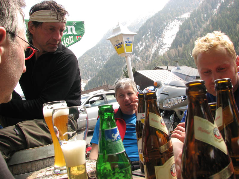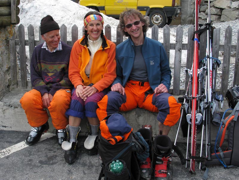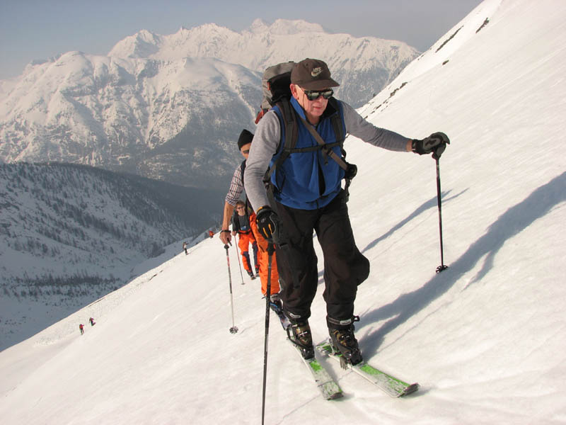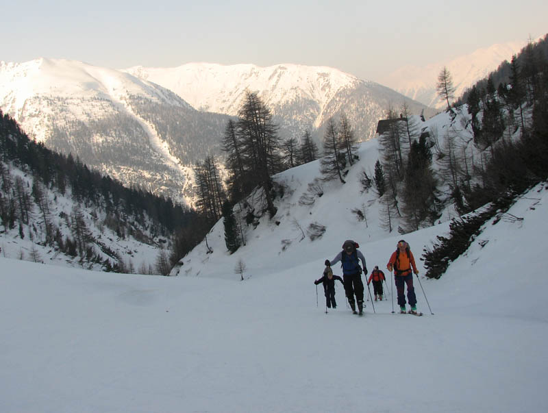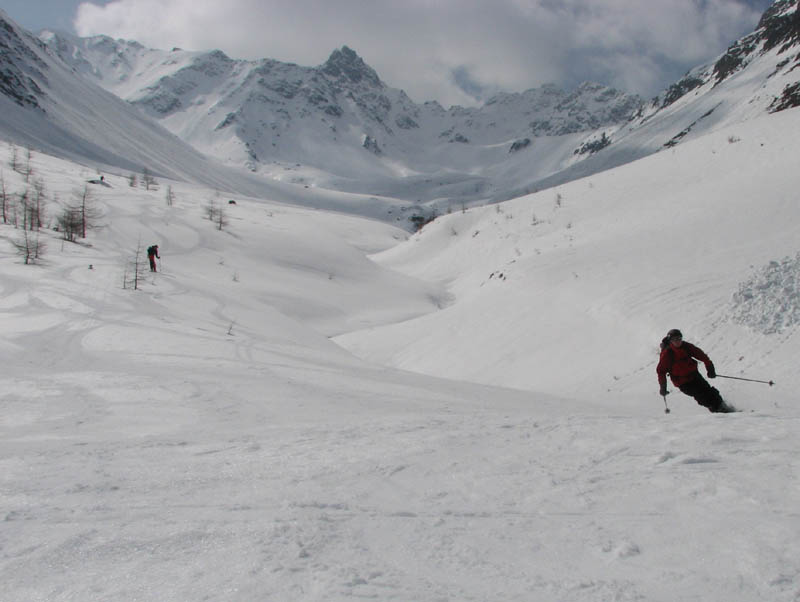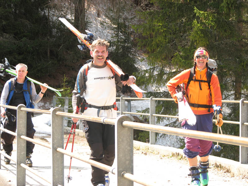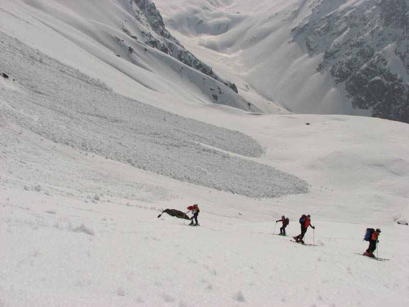 Die etwas angriffslustigere Abteilung wollte sich gleich mit Manni am ersten Tag eine Perle greifen und die Nuna Scharte überschreiten. Das VaL Laschadura war von einer großen Hochwinterlawine angenehm aufgefüllt, die großen Bollen der kürzlich abgegangenen mächtigen Gleitschneelawinen konnten leicht umgangen werden und dienten mehr dem Aufpeppen der Kullisse. Zwei Freitag- Morgen Nachzügler konnten sich gleich noch an die Fersen der Gruppe heften und so zogen doch 12 Personen bei angenehmen Verhältnissen die steileren Hänge hinauf Richtung Piz Nuna. Auch die 2 oberen Steilstufen waren gut begehbar und hätten sicher auch angenehme Firnverhältnisse hergegeben, doch das Ziel war ja das lange Val Nuna drüben runter,