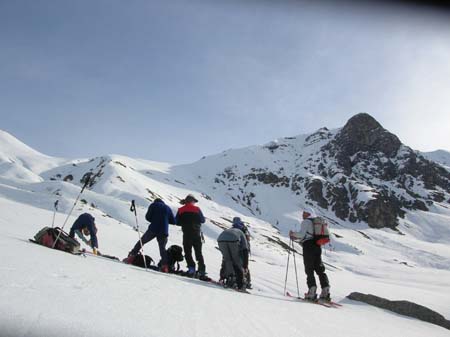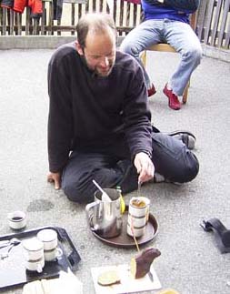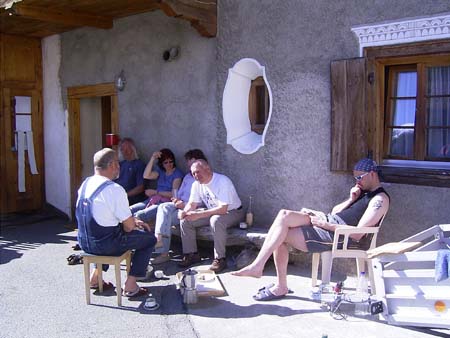Sogar eine Einheit Terassenkaffee ging sich noch aus, wozu dann auch die Mannschaft von Tommi dazustieß, die vom Piz Belvair zurückkamen. Später, zum traditionellen´Kasspatzenkochen, verstärkten uns noch Simone, Melanie und ihr mitgebrachter Überraschungsgast (O- Ton: “ die brauchen den ganzen Herweg it oimal das Radio” ).