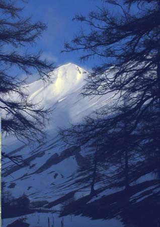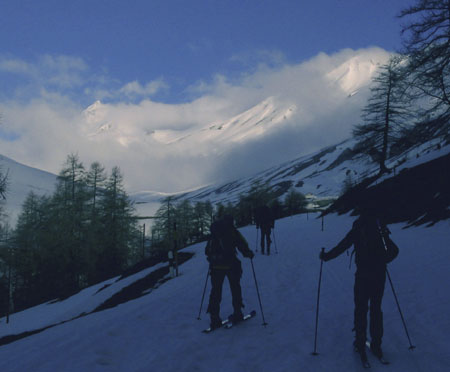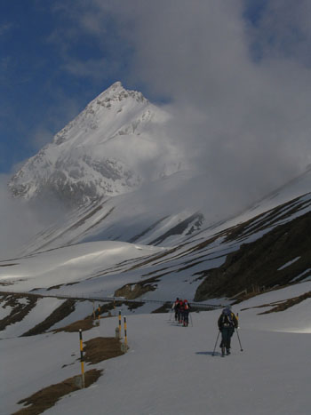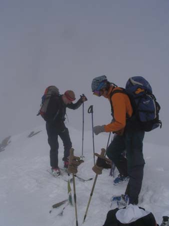 Interessante Morgenstimmungen bis zum Beginn des Steilhanges, dann etwas Stress bis alle gut auf der Terasse oberhalb waren. Leider begann sich schon eine kompaktere Wolkendecke zu bilden, in die wir dann beim Beginn des Schlusshanges aus der Südostschüssel heraus eingedrungen sind. Vorsichtiges Hochtasten entlang des Westgrates, und immer wieder gings mit Ski weiter bis hinauf zum Gipfel. Nach der Gipfekzone mit etwas brechendem Schnee Firn pur, leider ohne Sonne und mit diffusem Licht (was mir kurz vor der Strasse noch einen sauberen Purzelbaum bescherte