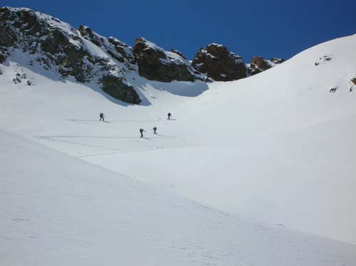 Massenstart ins Val Fain- noch ziemlich bedeckt und etwas wärmer als ehofft. Ungefähr an der Stelle mit dem Bild teilt sich die Riesengruppe: Links rauf ziemlich dämpfig in steilerem Gelände und unsichtbarem Ausstieg aus dem Hang -> Tempoverschärfung.