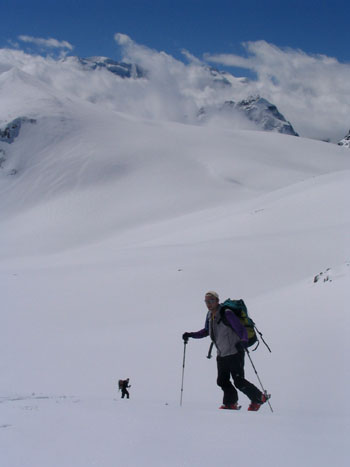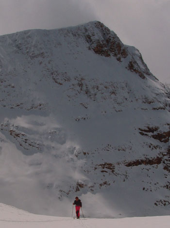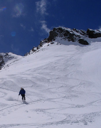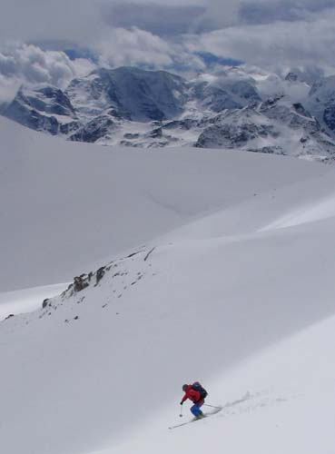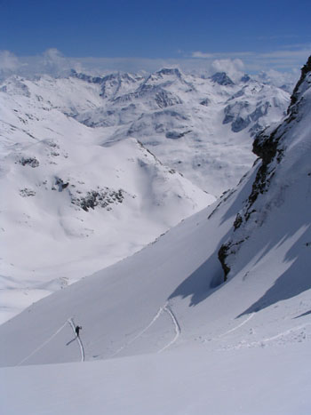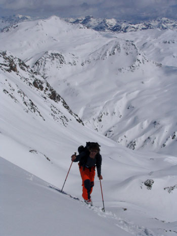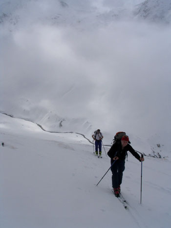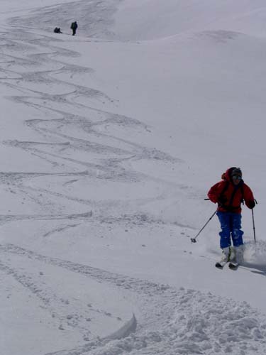 Oben runter im steileren Nordhang nochmal Pulver, dann schon firnig rüber zur Einfahrt in den unteren Hang. Leider hat´s wieder etwas zugezogen, und im Hang ist ein “Firn” der tieferen Sorte” ,aber auf einer schmalen Rippe lässt´s sich´s sicher und relativ gut runterkurven. Warte mit Tommi auf die Minor Truppe für´s rausschieben, und dabei tut´s dann tatsächlich nochmal auf.