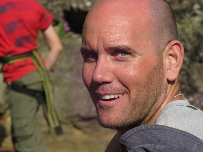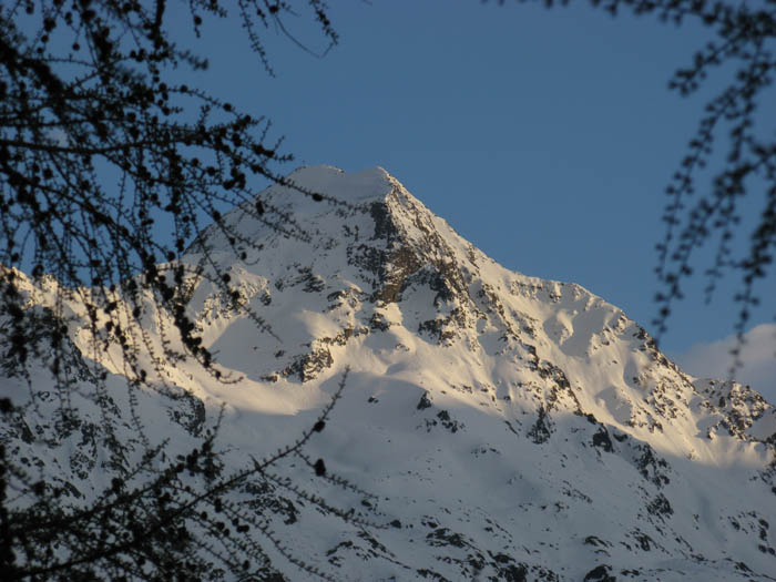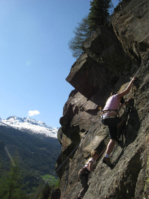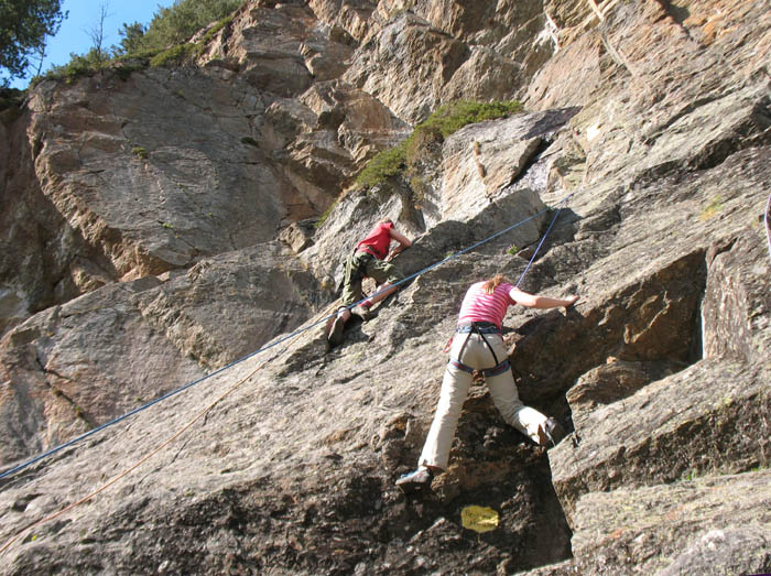 Nach etwas zäher Anfahrt kommen wir am schönen Campingplatz in Längenfeld an (mit 5 Sterne Klo) und finden einen schönen Wiesenplatz weitab von potentiell Belästigten. Zeltaufbauen geht erstaunlich flott vonstatten, Franz und Benedikt haben einen besonders interessanten Platz ausgesucht. Da im Herweg der Felsen in Tumpen schon gut besucht ausgesehen hat, ändern wir den Plan und fahren noch ein paar KM weiter das Tal rauf nach Sölden und dann links etwas hoch. Von der Moosalm stürmen wir in einer Viertelstunde zum schön in lichten Lärchenbeständen gelegenen Kletterfelsen. Dort gibt es eine reiche Auswahl an leichteren Touren für jeden und alle sind fleißig am Klettern, von gegenüber grüßen verschneite 3000ér.