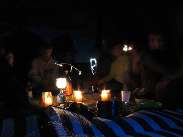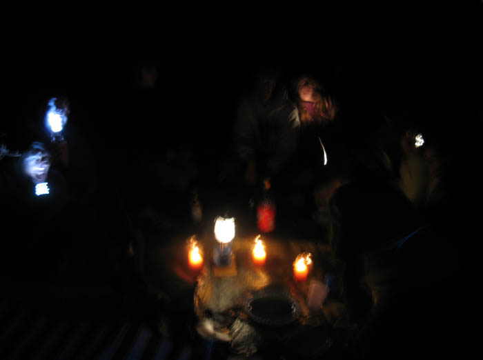 Es wird auch nicht so kalt wie befürchtet, und gut eingepackt und mit Gitarreklängen halten wir es um unsere Kerzentafel bis nach Mitternacht draußen aus.