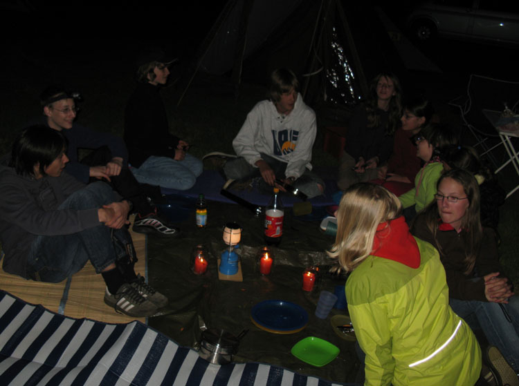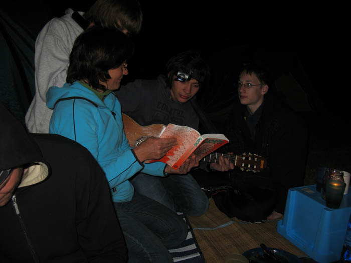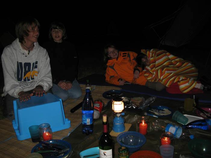 Wir bleiben am Felsen, bis die Sonne weggeht und kommen so erst bei Dämmerung am Zeltplatz an. Sofort wird der große Speisetisch hergerichtet (Plane am Boden ausgebreitete) und losgeschnipselt. Dann gibt noch eine Gasflasche ihren letzten Hauch, so dass wir beim Kochen etwas improvisieren müssen und sich die Sache etwas hinzieht, am Schluss gibt es aber für jeden einen großen Schlag Nudeln, je nach Gusto mit weisser oder roter Soße und danach eine große Abspülfete im 4 Sterne Klo.