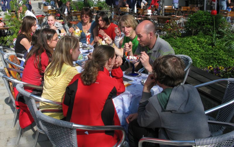 Nach der Pizzeria hatten wir uns gerade eingerichtet in der zeltstadt, als uns regen in das große Festzelt vertrieb.Gegen morgen war es dann aber wieder trocken und zum Frühstück sogar teils sonnig, auch zum Abbauen der zelt. Dafür war uns dann nur ein relativ kuirzes Klettervergnügen gegönnt, bevor es wieder anfing. Erst am heimweg kam bei Marktoberdorf die Sonne wieder raus- Eiswetter.