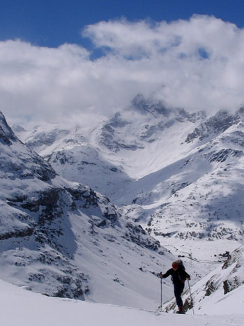Freitag (bestes Wetter nach nächtlichem Schneefall) Gruppe mit Wolfi: Val Nuna von Giarsun: oben ca 30cm leicht gepackter Neuschnee. Dank eines frühaufgestandenen, konditionsstarken Solisten fiel die Entscheidung " Go" für den Schlusshang deutlich leichter. Erstaunlich viel Auflauf, da zufällig andere große Gruppe mit uns unterwegs war. Abfahrt, oben Pulver (zuerst verfrachtet, dann gut und da die andere Gruppe noch den Gipfel aufsuchte, noch gut Platz) unten gut fahrbarer feuchter Neuschnee Gruppe mit Manni: Piz Uter von Zuoz, auch genug Leute, aber oben rein sehr gute, freie Hänge mit Pulver Samstag (nach klarer Nacht zunehmend hohe SchichtBewölkung) Manni: Nuna Scharte von Süden (Ofenpassstrasse), unverspurt meist Firn oder dünner Deckel, Schnee bis runter, Manni fällt in Bach, kann aber abends noch Kässpatzen kochen Tommi: Piz Belvair von Madulain, Schnee siehe oben, ganz unten ein paar Meter tragen Volkers Powertruppe (“ Feinde der Richtungswechsels”) Diverse Scharten überm Val Barlasch (Sarsura), oben dicht sturzkassenfreundlicher Bruchharsch Sonntag (früh leichter Nieselregen, schnelle Besserung am Vormittag) Massenstart an der Diavolezza ins Val da Fain, unverspurt Manni + Bernhard: Piz Minor, oben Pulverauflage Wolfi: links ab zum Piz Pischa, oben Pulverauflage, unten tiefer Sulz Montag (schön nach klarer Nacht, im Süden hohe Wolkenfelder) Manni: Laschadura (oben Traumfirn, unten etwas faul) (Manni bekam einige neue grauen Haare, bis alle den Gipfelhang oben waren) Bernhard: Piz Pischa am Berninapass, Traumfirn Bernhard und Arthur. Erfahrung macht die Frauen glücklich Wolfi: (Genießertruppe) Muntische (wo die Geier über uns kreisten), oben Firn, unten Faul (außer für Simon, den hat´s noch getragen) Dienstag: (zuerst sonnig mit Wolkenfetzen, dann Schicht auf ca 3000m) Piz Blaisun vom Albulapass, gute Verhältnisse, über die Südostschüssel mit den Ski bis auf den Gipfel, leider war´s oben dicht und bei der Firn- Abfahrt keine Sonne.