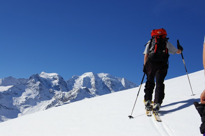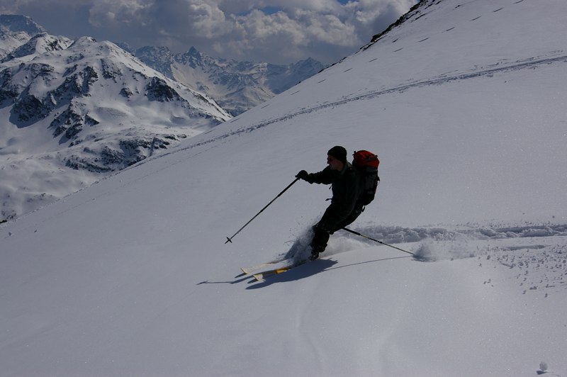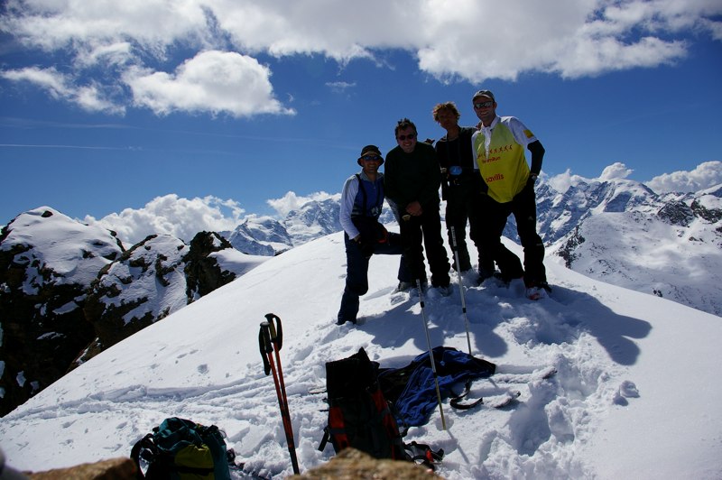machte, in Abwandlung des Planes über die Südostabdachung des Piz Albris, wo sich doch noch eine zusammenhängende Folge von Schneeflecken abzeichnete. Lediglich ein richtig steile Spitzkehre (Kommentar Bernhard - "Danke Tommy") war notwendig, um den Brotzeitplatz bei den kleinen Seen zu erreichen. Dort marschierte allerdings Bernhard an der lagernden Gruppe zielstrebig und wortlos vorbei und die fragenden Blicke wurden beantwortet mit einem lapidaren, aber alles erklärenden "Bolli machen".