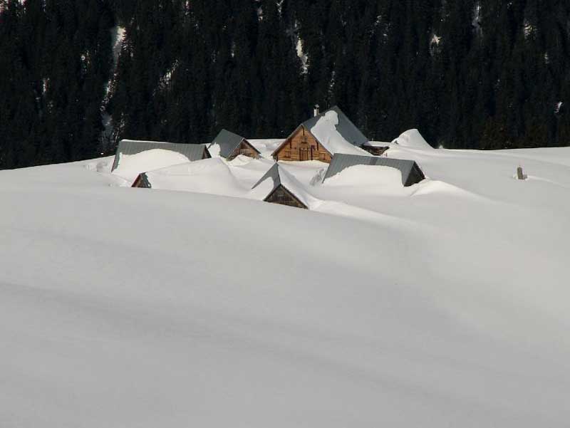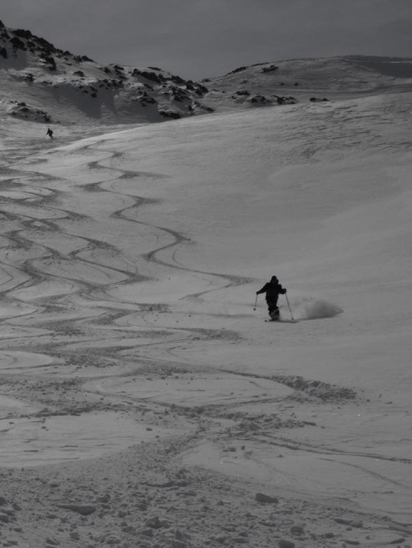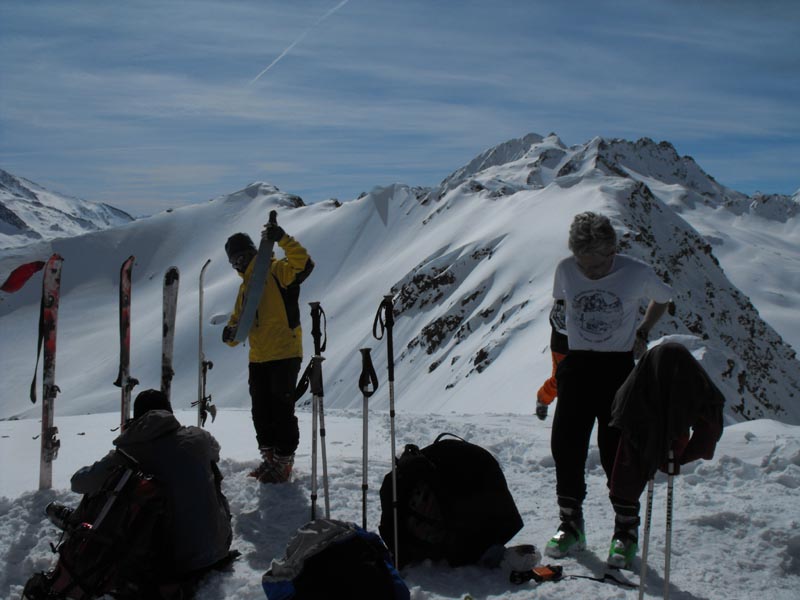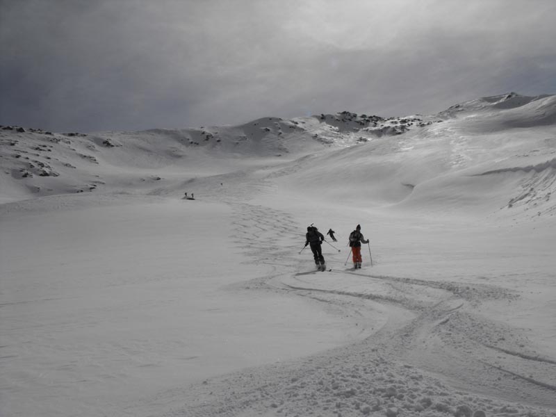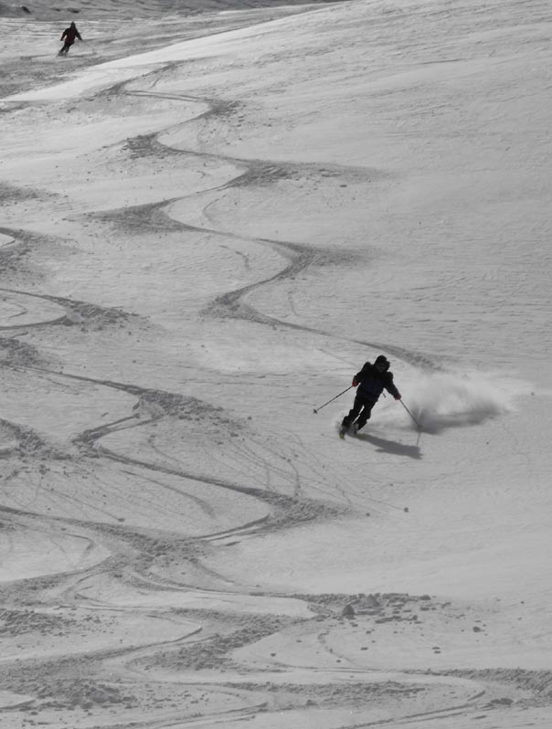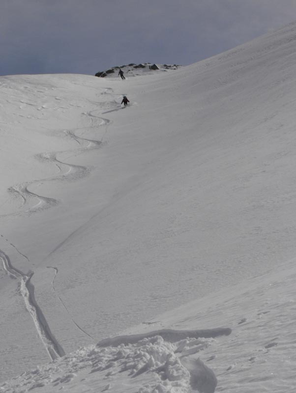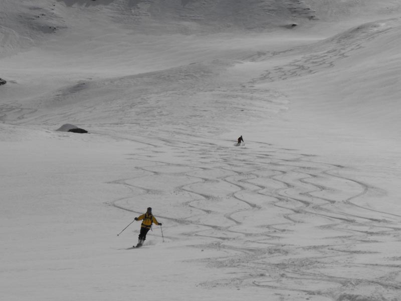 Nach den meist flacheren Mulden des oberen Teils folgten noch ein paar steilere Stufen, die wir bis auf eine Terasse knapp oberhalb der teifverschneiten Alp Pazzola ausnutzten. Da alle noch gut drauf waren, gab es auch keinen Widerstand gegen einen Varianten Vorschlag mit Refelling, und damit konnten wir noch weiter schön im Tal in die gleiche Richtung hinunterfahren und mussten uns nicht um´s ausqueren kümmern.
