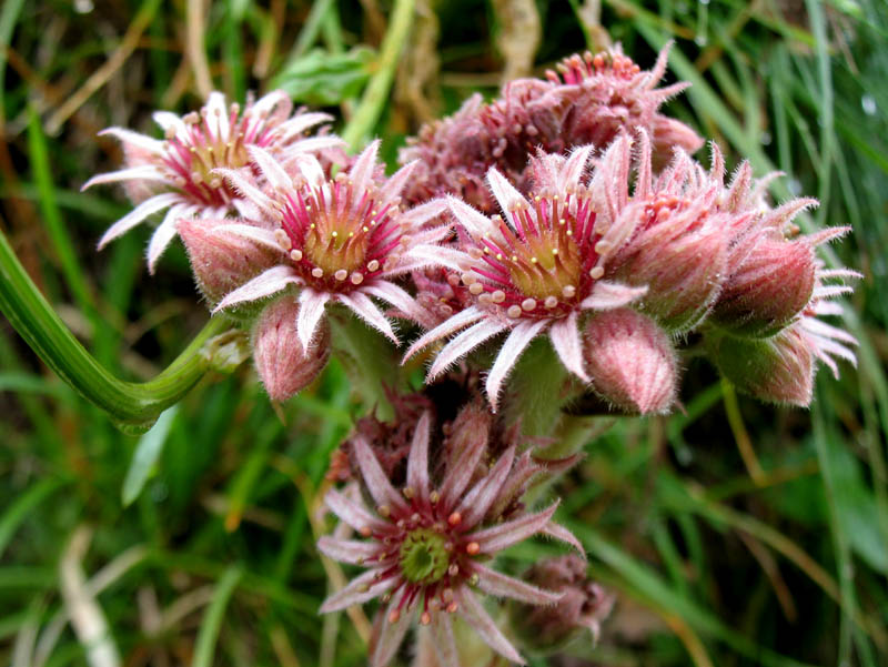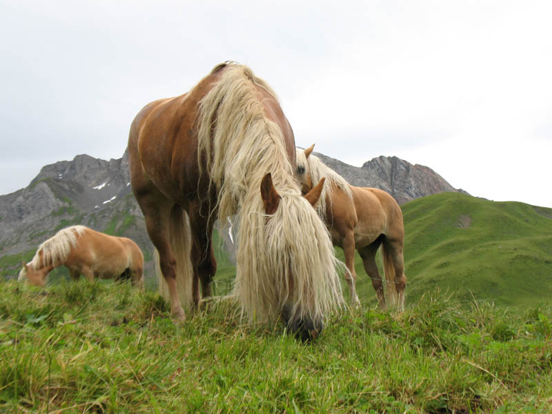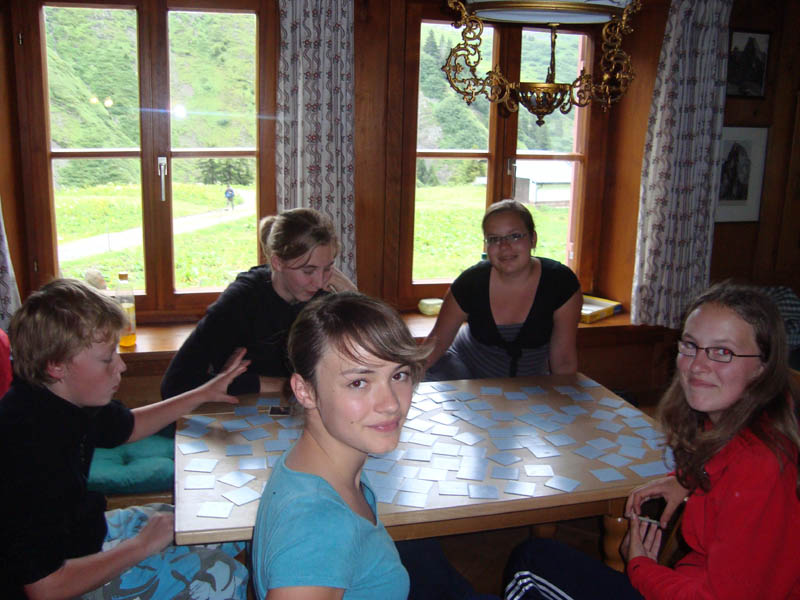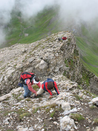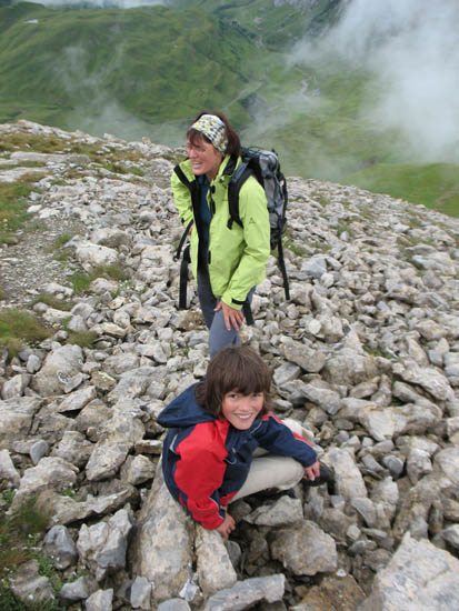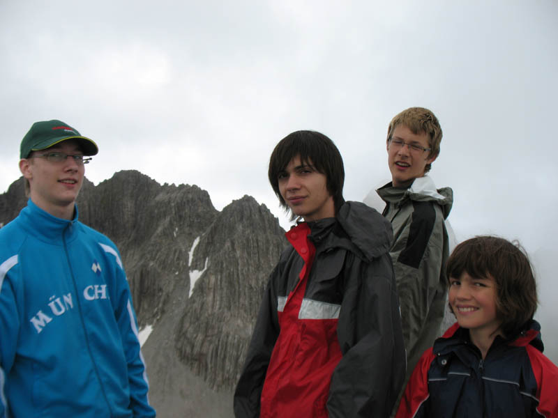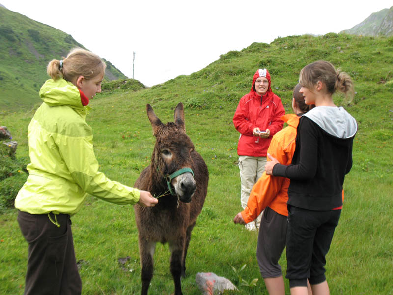Am nächsten morgen aber regnet es wieder - zwar mit kleinen Pausen, aber doch nie so lange trocken, dass der fels richtig trocken wurde. Wir beschlossen einen verlängerten Spaziergang zu unternehmen, das heisst ein Teil beschloss das, die Mädels und einige mädchenhafte Jungs beendeten diesen Spaziergang “ wir sind doch nicht eseliger als die Esel hier” - als es wieder mal etwas nass von oben kam. Der hartgesottene Rest wurde aber auch nicht richtig nass, und so manche Schlitterpartie auf dem lehmig- glatten Weg gestaltete das Vorwärtskommen spannend, zudem gab es jede Menge schöne Flora. Am Schluss waren wir sogar noch auf einem richtigen Gipfel vor der Wildgrubenspitze und der Roggalspitze, dann stießen wir als Verstärkung zum verlängerten Spielevormittag auf der Hütte.