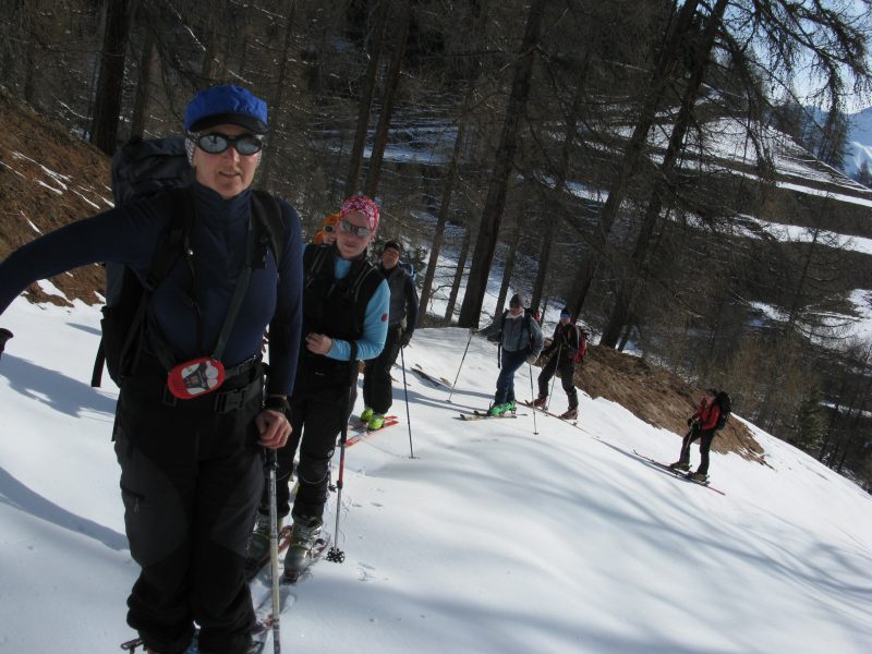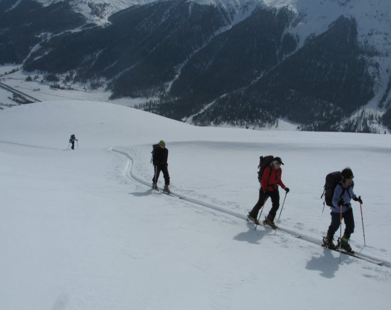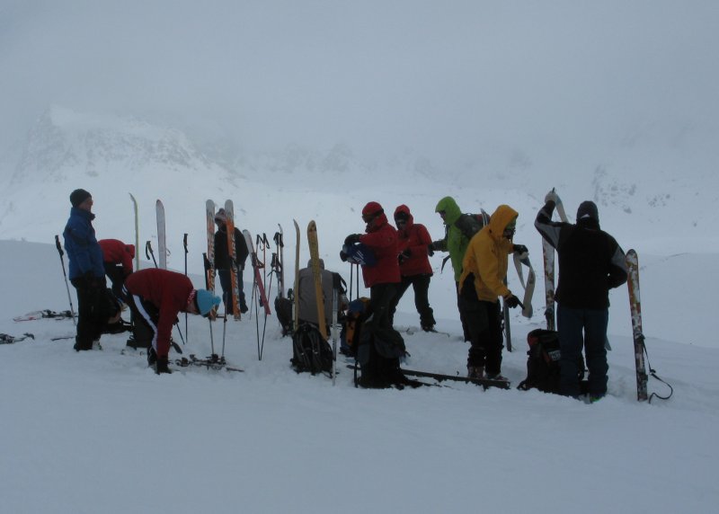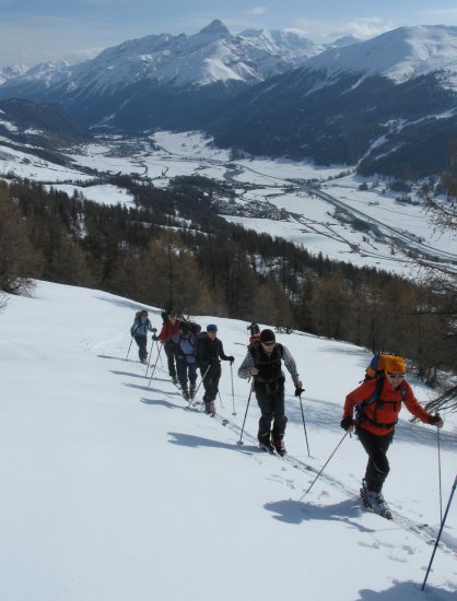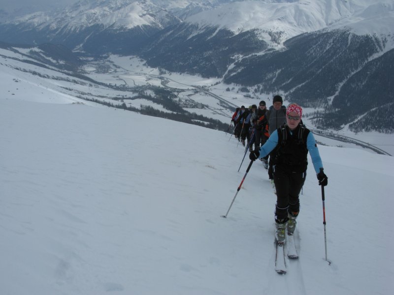 Trotz meiner Befürchtungen, an der Aufgabe kolossal zu scheitern, kamen wir dem Gipfel relativ komplikationsarm immer näher. Aber die über uns kreisenden Geier machten mich doch etwas nervös, auch die Tatsache, dass merkwürdigerweise der sonst übliche Redeschawall und das Stimmengewirr sehr moderat ausfielen, - war ich etwa viel zu schnell unterwegs ? Kurz vor dem Gipfel gab dann die blaue Aufhellung endgültig den Geist auf und dann hatte ich bei der Tourenplanung den Fehler gemacht, einen Gipfel mit einem großen, ebenen Plateau ohne schützende Felsen oder wenigstens Windgangeln auszusuchen, und Christoph hatte mir das mobile Damenklo nicht mitgegeben. Der Piz Kesch hatte sich mittlwerweile in Wolken versteckt, und es wurde frisch am Gipfel. Dafür hatten wir den ganzen Ostrücken runter guten Schnee, sogr durch letzte Strahlungsreste brauchbare Konturen und ich fand eine Einfahrt ins Tal nach links, wo wir durch die Lärchenschneißen weiter gute Sichtbedingungen hatten. Da wurde mir dann selbts die Passage auf der Talabfahrt mit Ihren eisenbahnschienenartigen alten Spurrillen verziehen und das kleine Tragestück zurück zum Bahnhof.