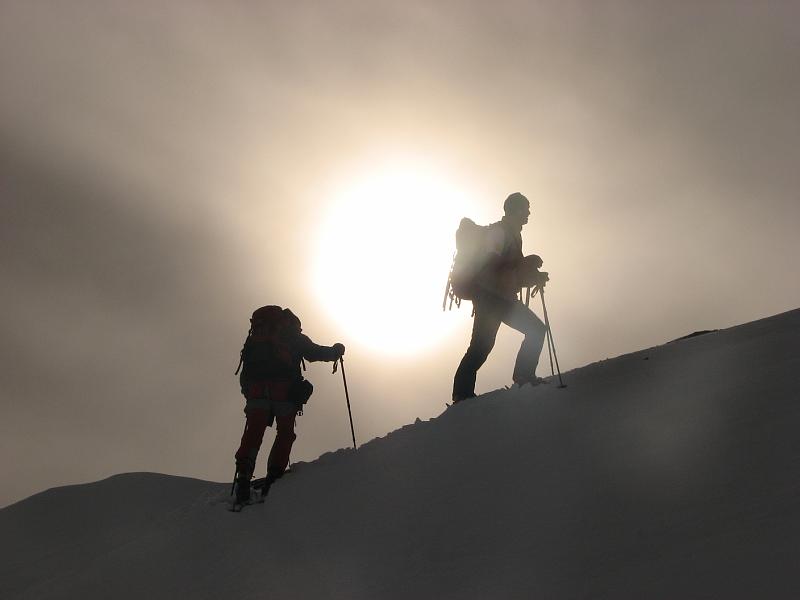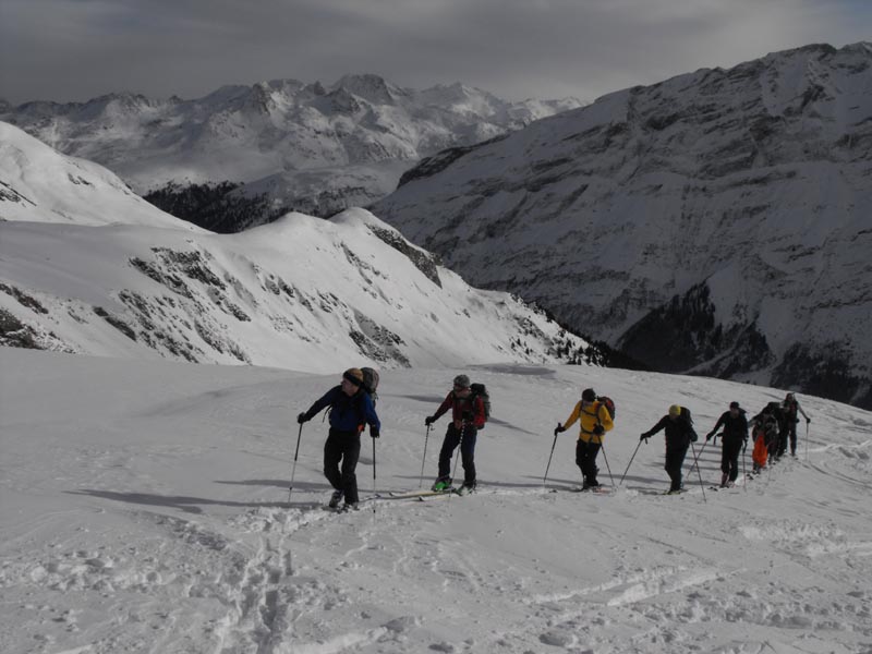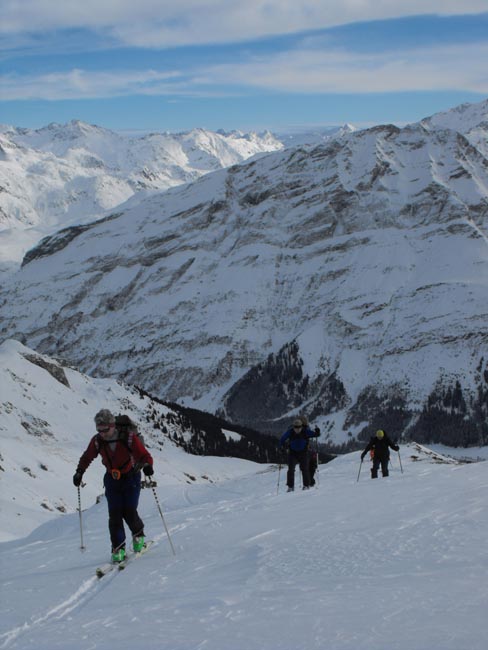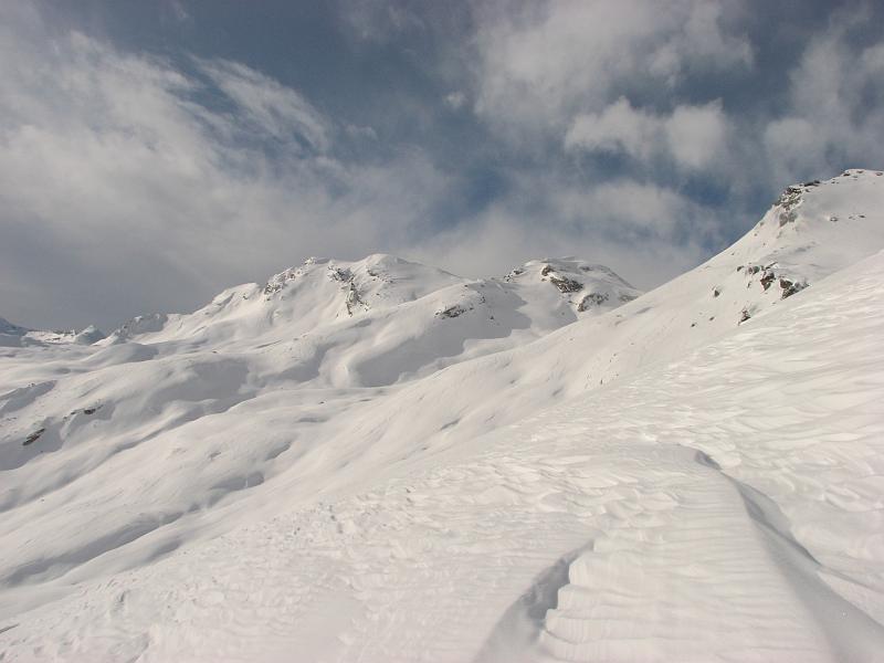 Dazu eine etwas wacklige Wetter- Prognose für den Samstag mit Schneeschauern in Aussicht ließ uns auf den sanften Südostrücken des Tällehorns setzen, der sichere und orientierungstechnisch einfache Fortbewegung versprach. Beim Start im tief verschneiten Nufenen war das Wetter aber recht freundlich, allerdings gab es in kleinen Ablagerungen schon die ersten Wummgeräusche. Am Rücken entlang war es aber dann meist abgeblasener und die Sonne ließ sich immer wieder mal sehen, bis wir die letzten Hütten am Rücken erreichten.