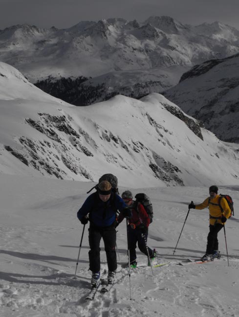 Nach einer kleinen Pause kam aus Südwesten sogar wieder vermehrt Blau hervor, dafür ließen verblasener Schnee und die wenig überzeugenden Schwünge von ein paar Vorgängern wenig auf ein Skivergnügen hoffen. Kurz vor dem Gipfel verlangte ein steilerer Aufschwung dann doch ein paar Spitzkehren, aber ein paar Mulden neben dem Aufstiegsrücken ließen auch auf ein paar ordentliche Schwünge hoffen. Dazu die weitreichende Aussicht über Piz Platta hinweg zur Bernina und Bergell.