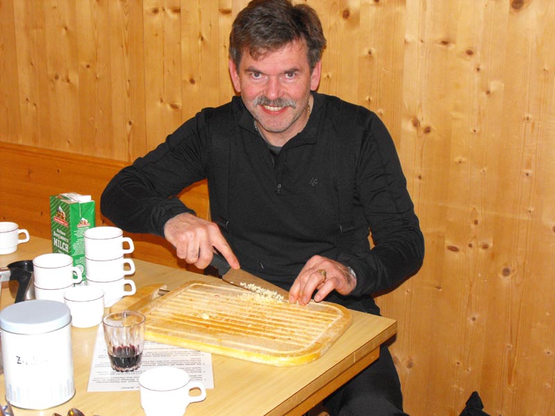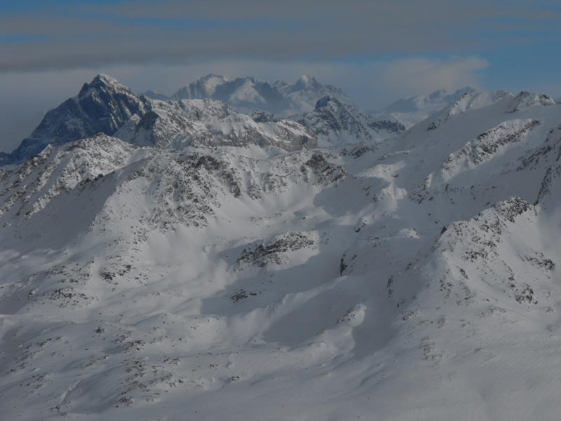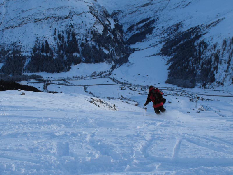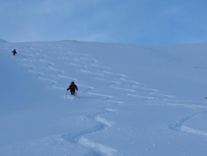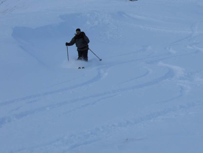 Durch die steileren Passagen vor dem Gipfel, die sich dann immer gut am Grat entlang austricksen ließen, war auch etwas Abwechslung geboten, und so sind uns die 1250hm bie mittäglichem Start gar nich besonders aufgefallen. Oben wurde es dann aber recht bald ziemlich zapfig, und so verlißen wir diesen Ort wieder, um die einzelnen flacheren Mulden neben dem Aufstiegsrücken anzutesten. Tatsächlich hatzten diese nicht zu viel versprochen und auch die Fahrerei am Rücken entlang war dann gut und zügig zu bewältigen, und immer wieder konnten wir noch ein paar Pulverstreifen auskosten. Dies gipfelte in besonders schönen und etwas steileren Schlusshängen, die uns dann in beschwingter Stimmung in die ortliche Lokalität entließen.