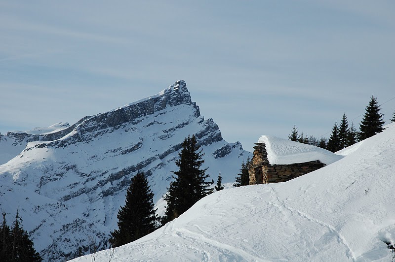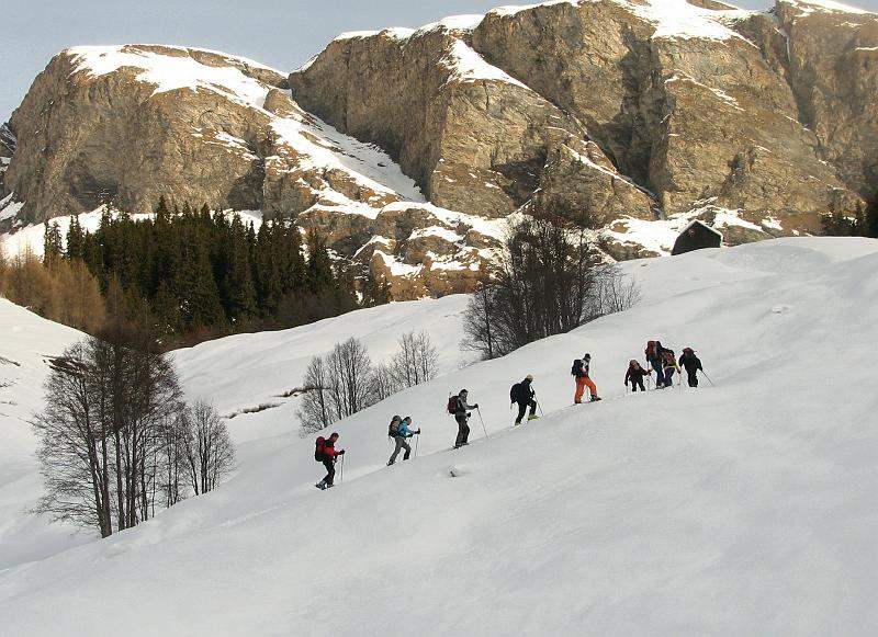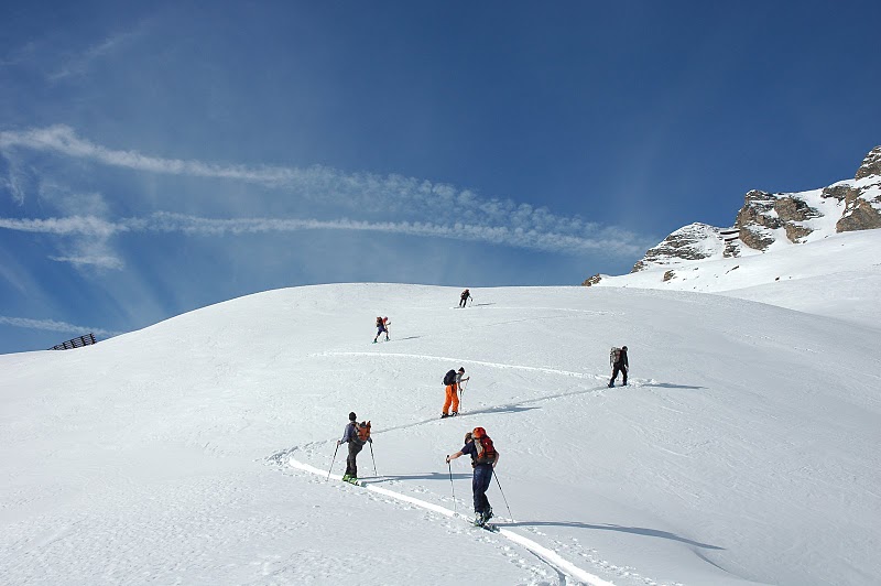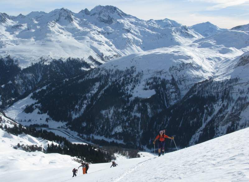 Am Sonntag morgen nutzten wir den Heimvorteil und starteten direkt vom Haus weg, zuerst über einen Wiesenrücken, dann in schönem Gelände neben dem Bachlauf, der von der Schollenalp herunterkommt, Unterhalb der Südwände des Schollengrates ging es über ideales Skigelände hinauf, der Blick zurück zur Surettagrupe oder zum markanten Einshorn im hinteren Rheinwald.