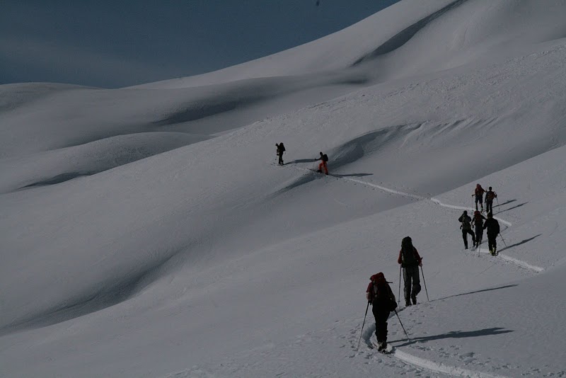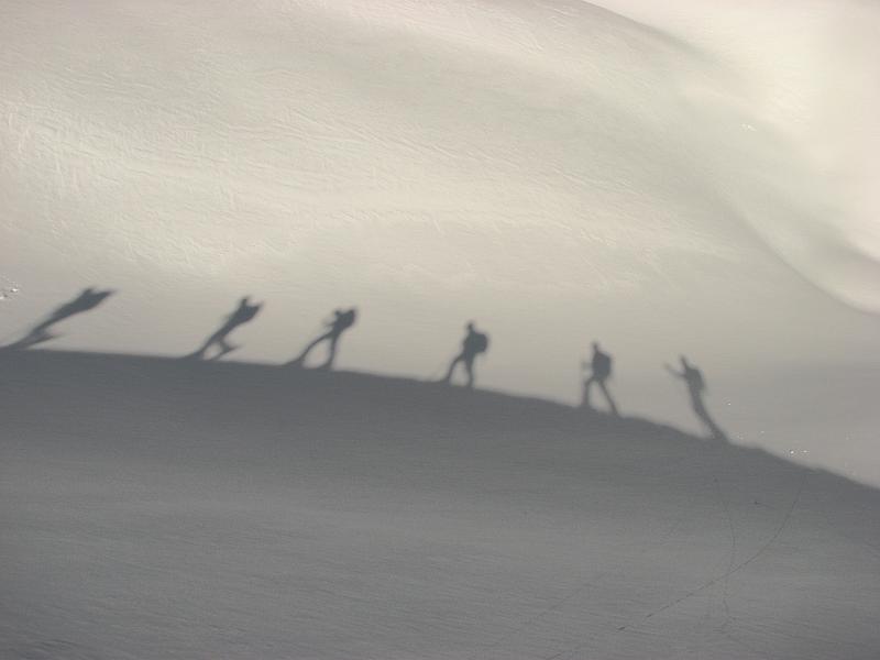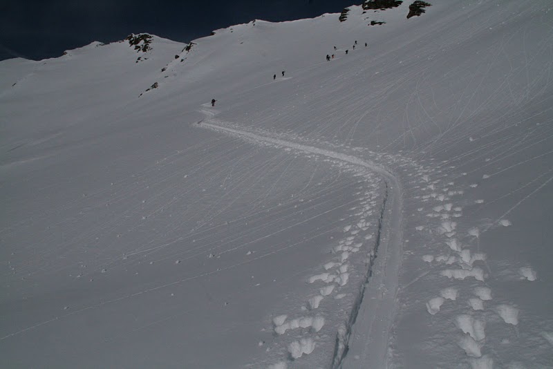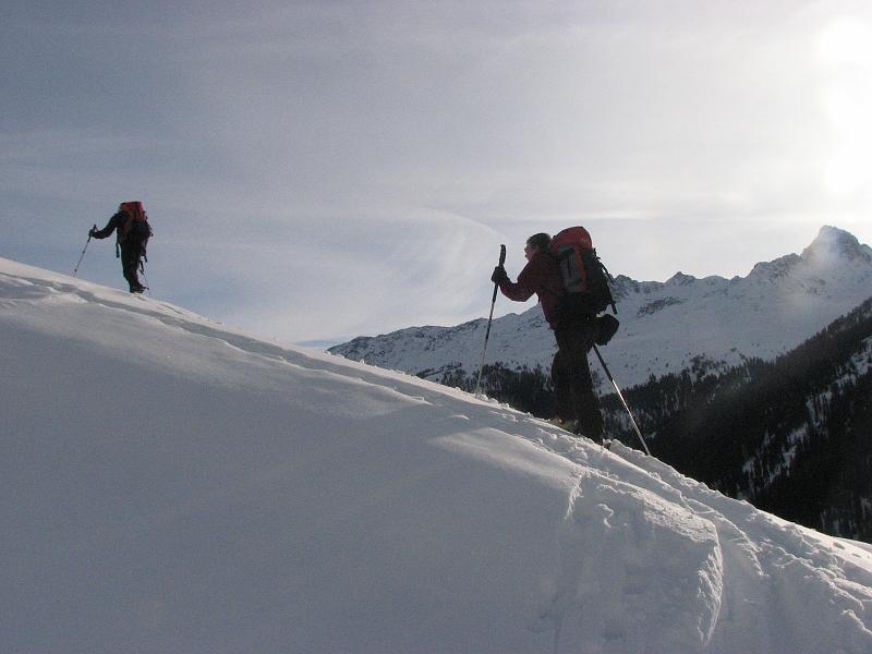 An der Ecke angekommen, inspizierten wir die Querung weiter hinüber nach Westen und den Hang hinauf auf den Grat westlich vom Schollenhorn. Ein Teil der Gruppe hatte keine Lust auf queren und zog lieber noch ein paar Kehren den Sporn hinauf, wir anderen querten auf schwach ausgeprägter Verflachung hinüber, bis wir unterhalb des Grates die Spur wieder anziehen konnten. Dabei kam in den ersten Kehren dort erstaunlicher Pulver zum Vorschein, was eine kleines Ergänzungsprogramm heraufbeschwor.