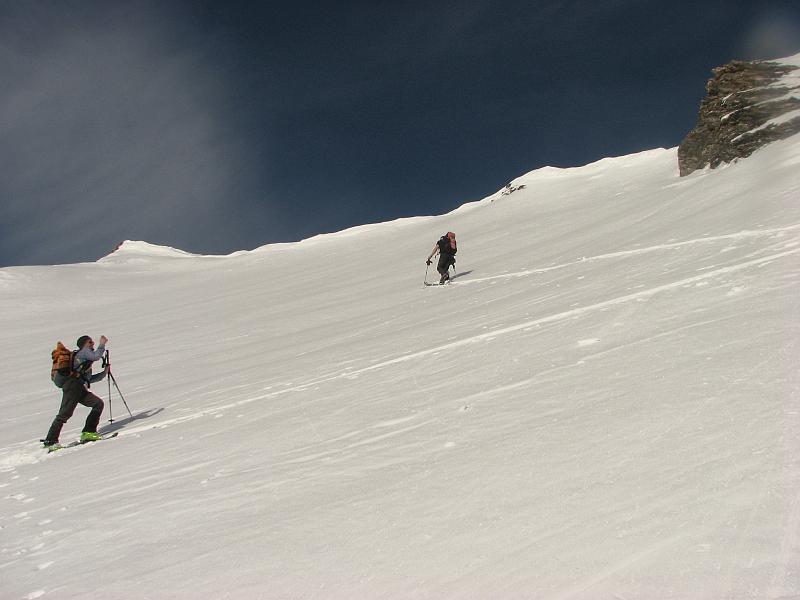 Nach einer größeren Pause legten sich dann die Hänge zurück und über eine Terrasse spurten wir westwärts zu einer Gratrippe , dem Südsporn des Schollenhorns über uns.