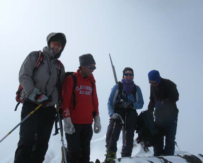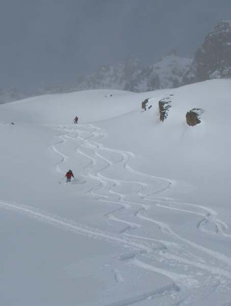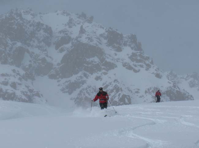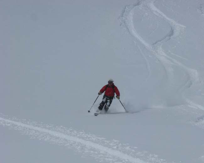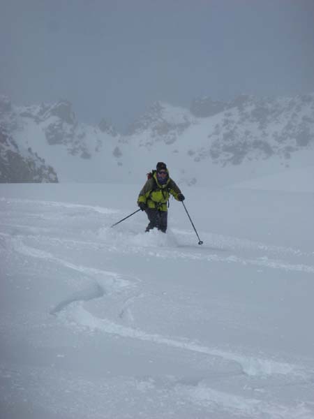 nach dem Gipfel (Karen wohl die erste Kielerin im Winter auf dem Sarsura?) schnell wieder runter zum Grat, wo wir über eine andere Einfahrtsrinne sogar den Gegenanstieg zur Scharte umgehen konnten. In dem steilen Hang beeindruckte uns Damian mit seinen Telemarkkünsten und hohem Tempo. In den Schüsseln weiter runter immmer schöner Schnee, der meistens auch noch ganz gutes Schwingen zuließ und meistens etwas Strahlung für eine brauchbare Sicht.