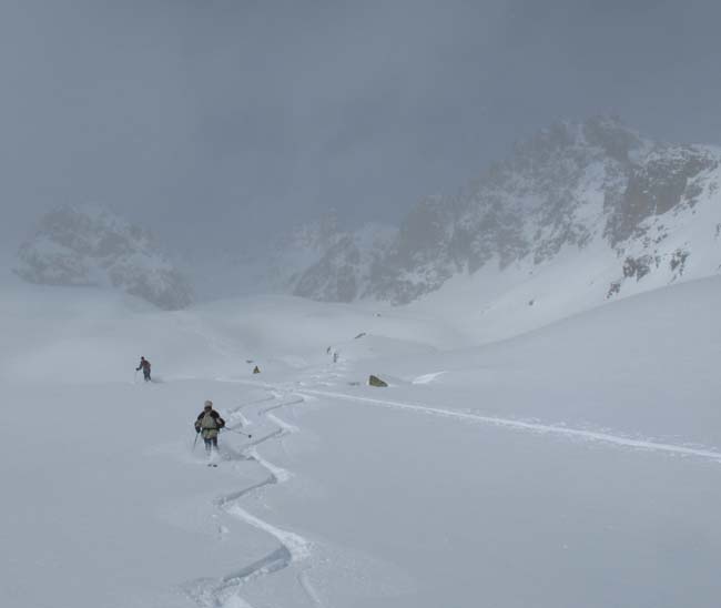 Wegen der Kälte gings flott bergab, den steilen Hang ins Tal und dann auf dessen Nordseite immer wieder schöne Pulverhänge