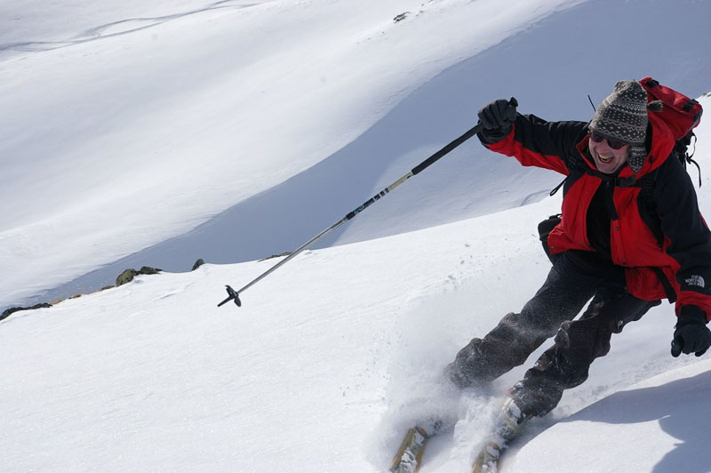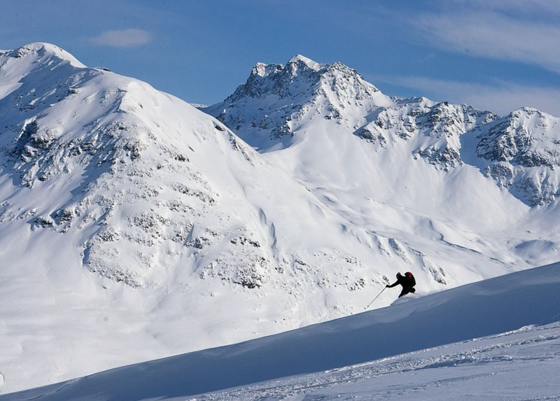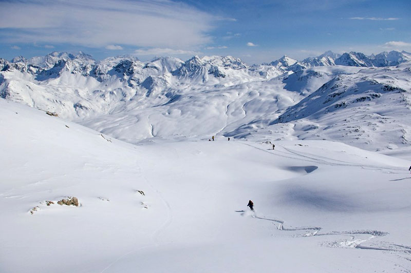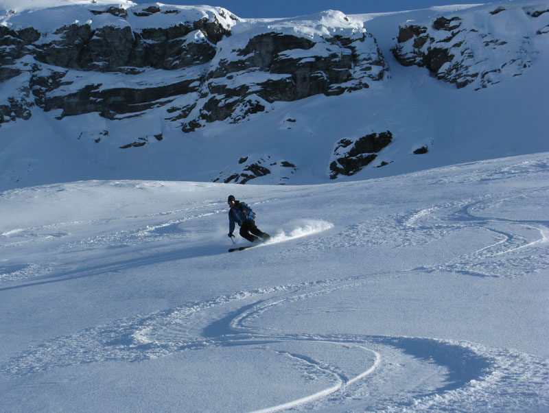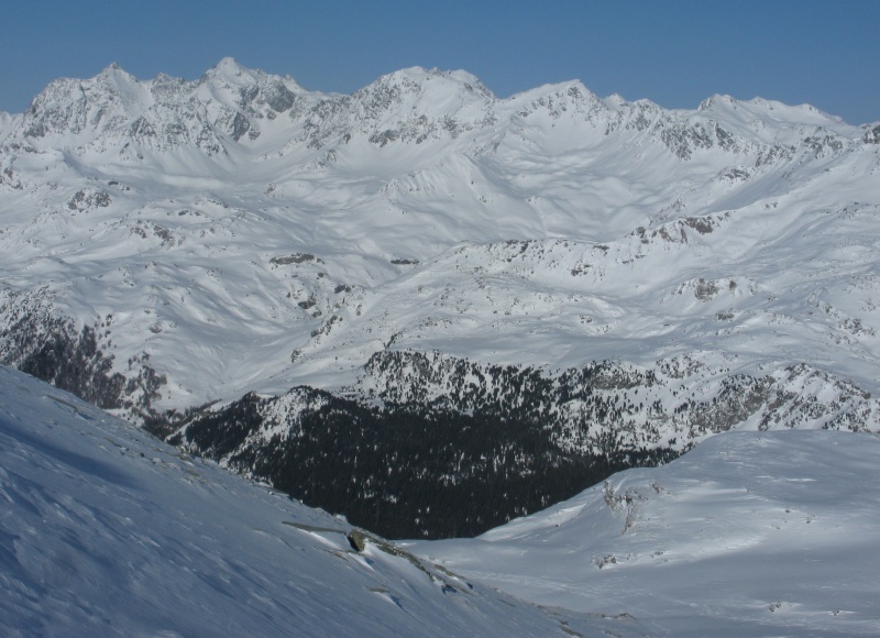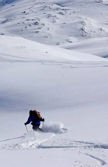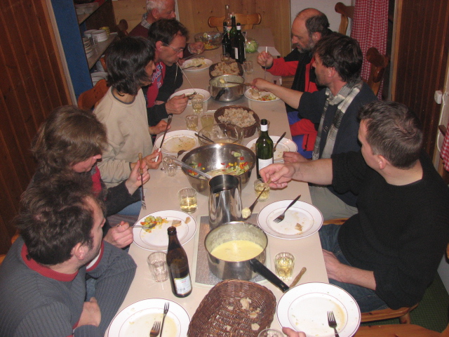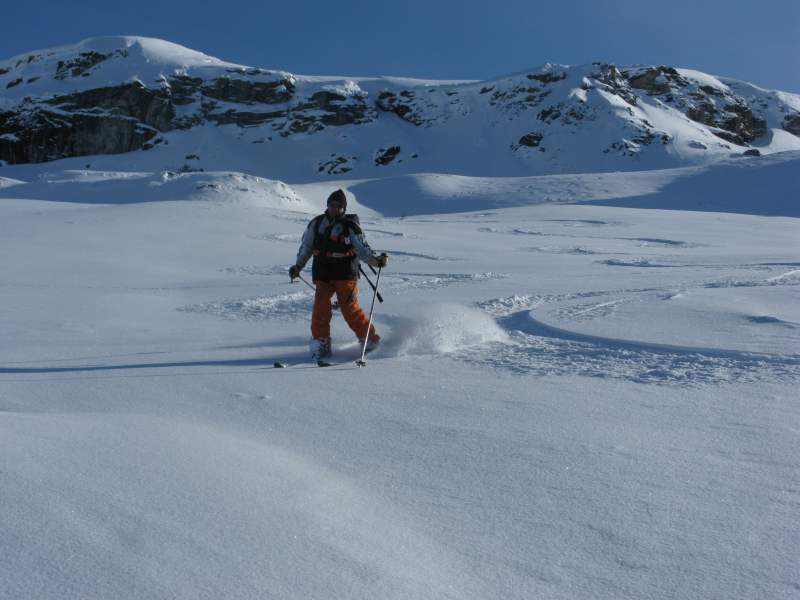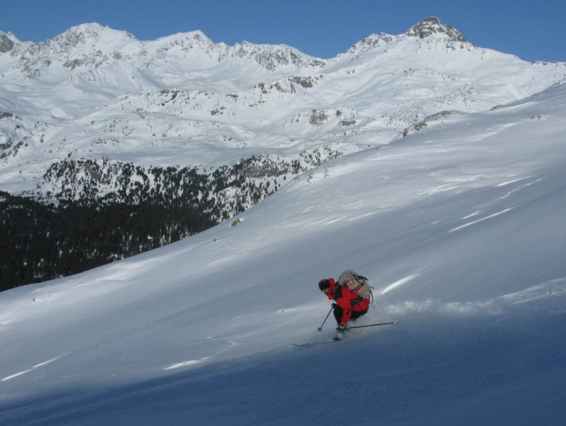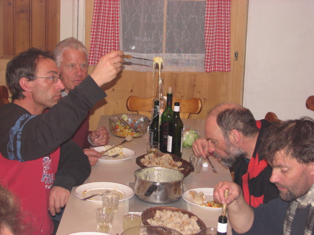 Die in der Föhnwoche stark bearbeitet Schneeoberfläche war zwar nur mit einer dünnen Pulverauflage verziert, aber trotzdem ziemlich gleichmäßig und gut zu befahren, so dass alle ihren Spaß hatten bis auf den Sturzkassenwart. Auf der Terasse gab es noch mal eine Organisationssitzung, dann zogen die Sonntag – Heimfahrer und ein paar weitere Personen weiter direkt nach Bivio hinunter, während ein kleine Refellinggruppe noch mal 300hm zum Ostausläufer des Piz Surpare hochspurten um dann nordwärts bei schönem Nachmittagslicht über weite sanfte Hänge Richtung Sur Ragn hinunterzuschwingen. Bis wir dort ankamen, hatte sich mittlerweile auch schon unser Taxi eingefunden und im Quartier war der Kaffee schon fertig.