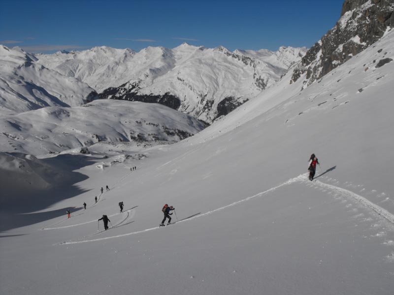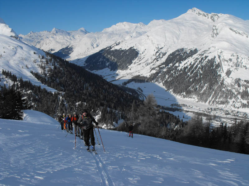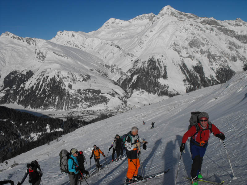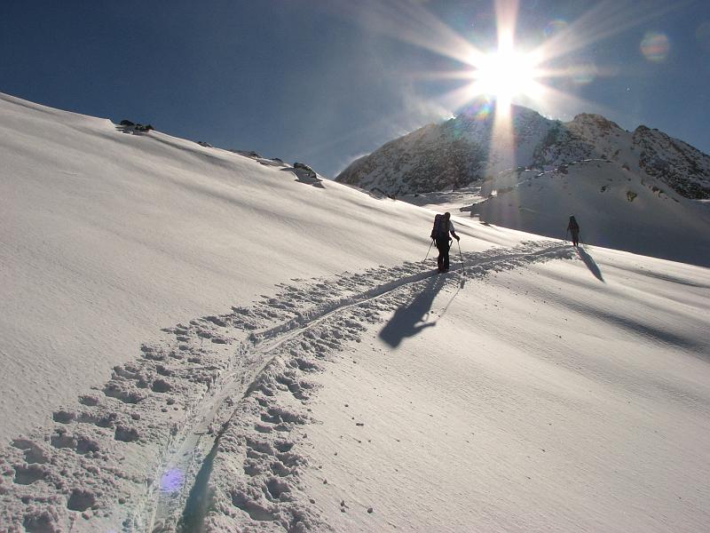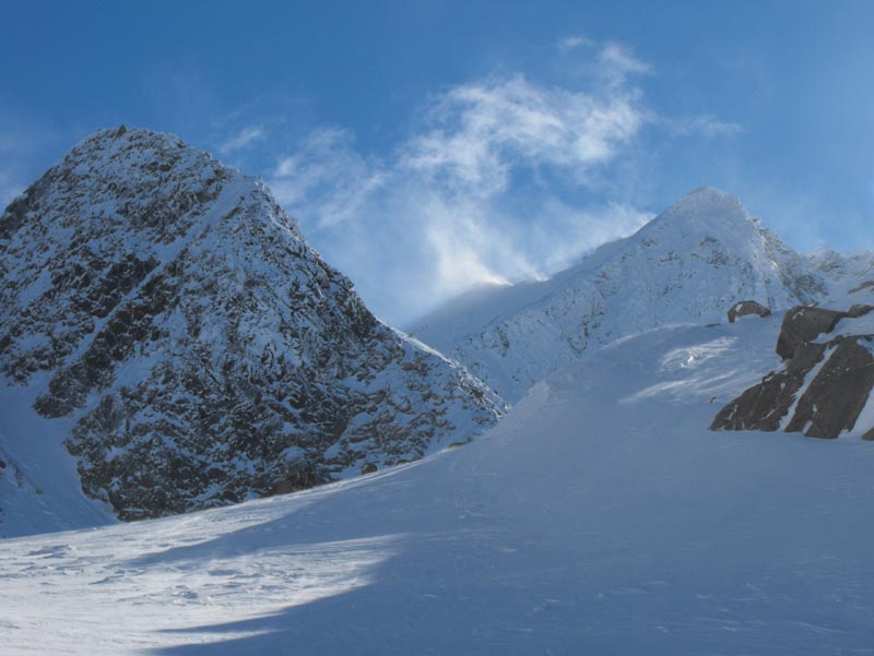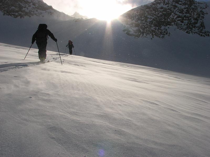 Oben raus kommt dann frischer Wind auf, eindrucksvolle Schneefahnen am Gipfel des Surettahorns und ein paar harmlose Wolkenfetzen im Westen. Die eigentlich angepeilte unter Scharte kann im Schatten nicht git beurteilt werden, dafür sieht die steile Stufe zur Surettalücke ziemlich ausgeblasen aus, so dass ich erst ma da hin ziehe. Tatsächlich ist heir nichts merh drin von dem großen Schnnefall, herauserodierte alte Spurreste und stabiler Untergrund machen den Aufstieg stressfrei. Dafür ist plötzlich die Sonne weg und es entwickelt sich ein Whiteout und empfindliche Kälte. So verschwenden wir keinen gedanken mehr an den kleinen Gipfel 2923 kinks der Lücke sondern machen uns möglichst schnell vom Acker und zur Abfahrt