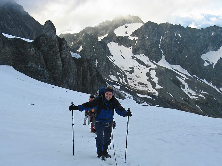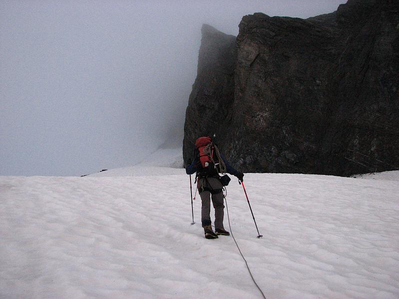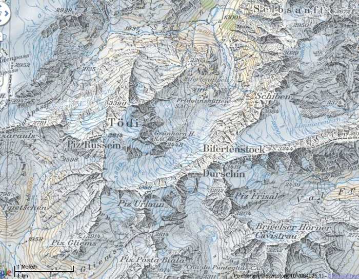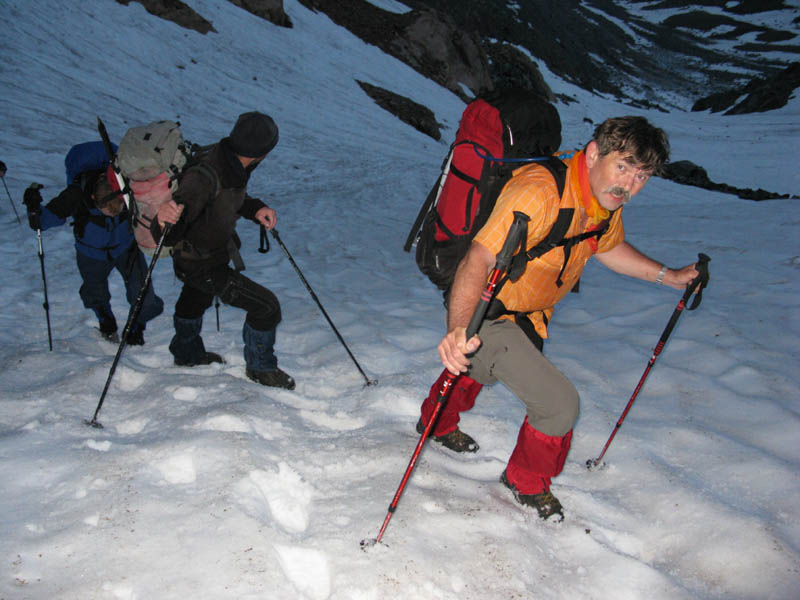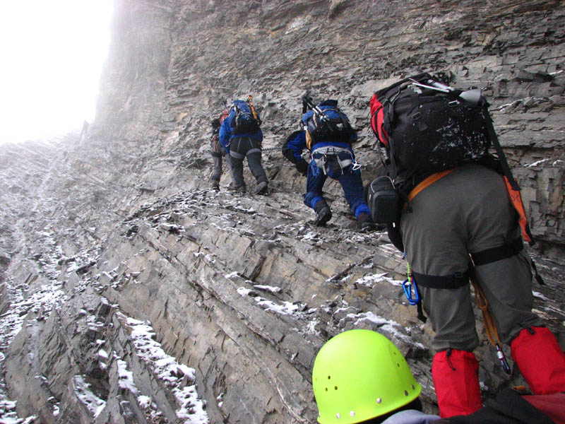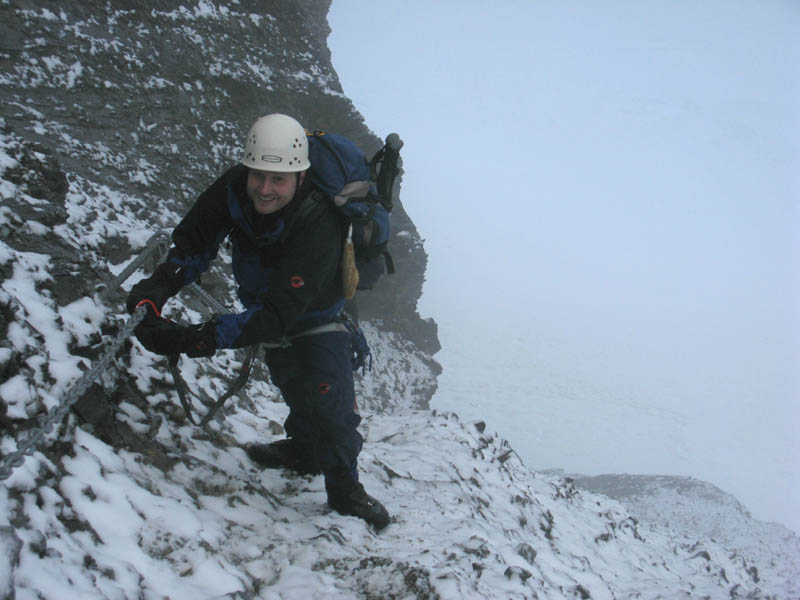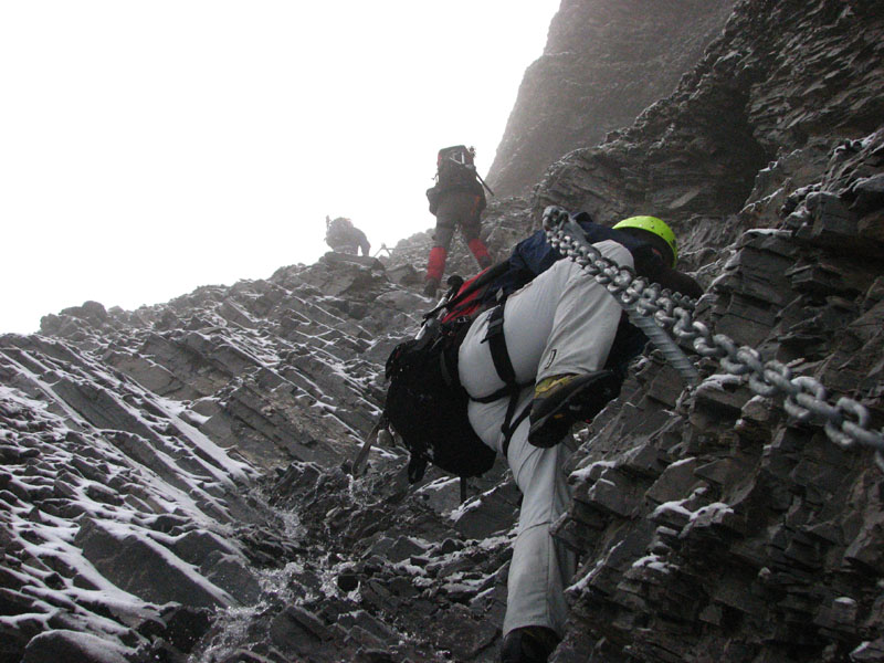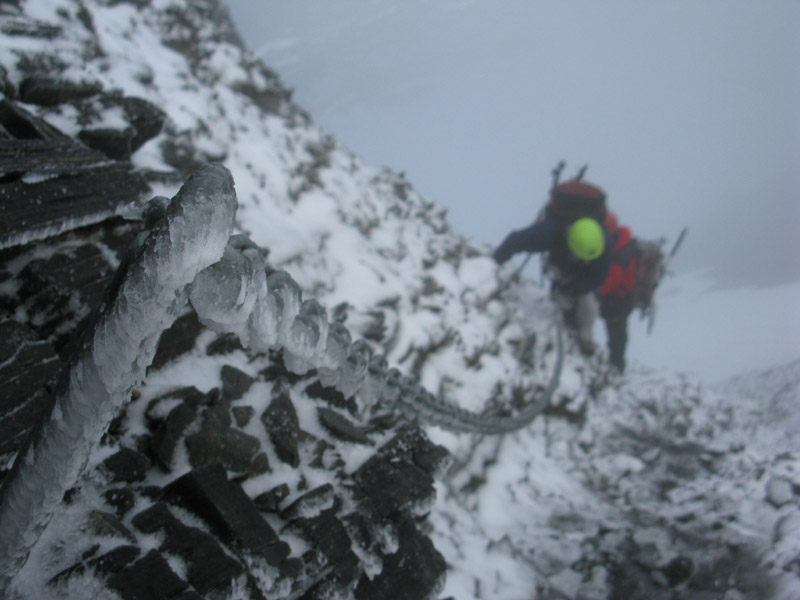 Wie ließen den 3 Schweizern etwas Vorsprung, um nicht in der Schusslinie zu sein, und folgten dann. Sinnvollerweise hat es hier Ketten, die auch in nassem bzw. vereisten Zustand gut zu greifen waren, dann das schiefrige, abwärtsgeschichtete Gestein bietet nur wenige und kleine Tritte, und ein paar cm Neuschnee drauf und der kleine Eisbach in der Abschlussrinne macht es auch nicht besser. So gab es die Ketten hinauf zwar kalte Finger, aber doch den einen oder anderen Schweißtropfen durch die anstrengende Fortbewegung. Ohne die gut und straff angebrachten Ketten wäre dies hier wohl wirklich ziemlich unangenehmes Gelände und da auch die Winterrinne weiter links schon lange ausgeapert war, wäre der Übergang über die Porta da Gliems wohl keine gute Aufstiegsalternative auf den großen alten Bündner.