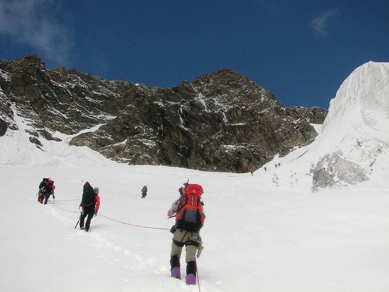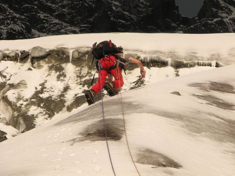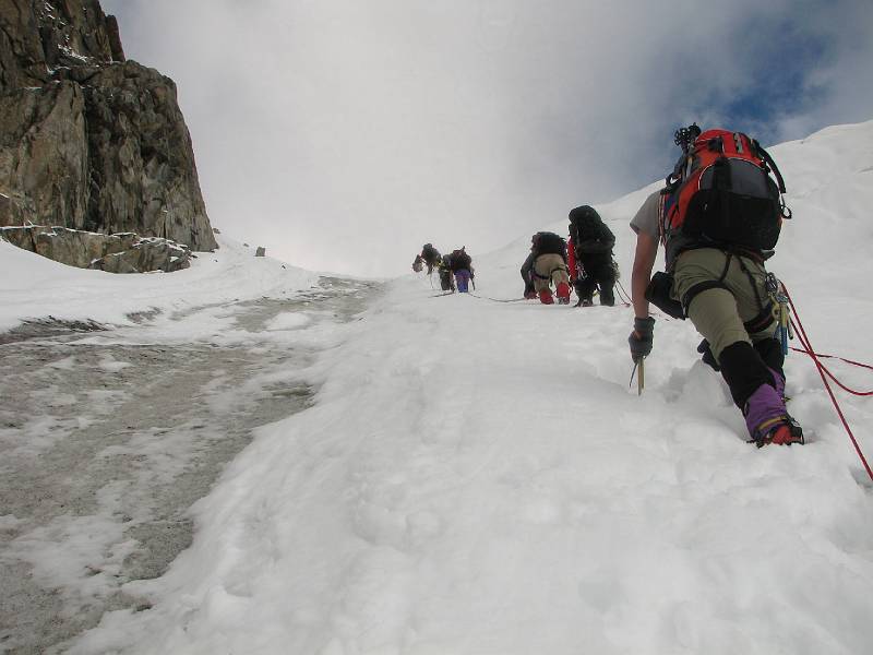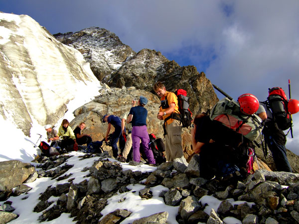 Am Hängegletscher angekomen: Die erste Stufe über die rechte Kante forderte gleich mal auf 70 Metern den vollen Frontalzackeneinsatz, da die paar Neuschneereste nur Makulatur auf hartem Eis darstellten. Da die Passage doch länger war, wie am Vorabend vermutet, kamen auch die Eisschrauben schon gut zum Einsatz. Die abendliche Theorieeinheit <<Fixseilbegehung mit Prusik>> wurde gleich ausgiebig in die Praxis umgesetzt. (öfters noch an diesem Tag). Alle meisterten die Aufgabe mit Bravour. Einige herunterschießende Felsbrocken weiter links im Hang zeigten, dass unsere Routenwahl trotz längeren blanken Passagen schon richtig war, obwohl diese Variante mit der größeren Gruppe natürlich etwas zeitraubender war