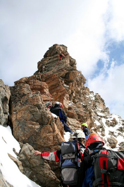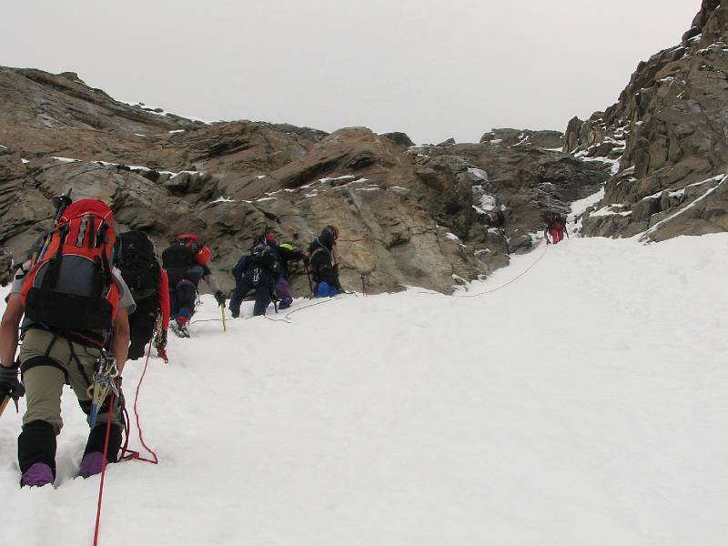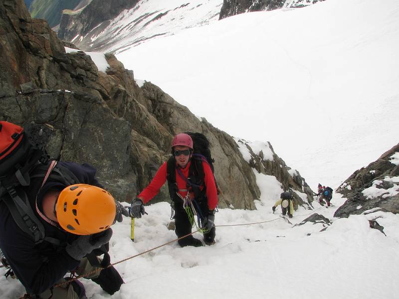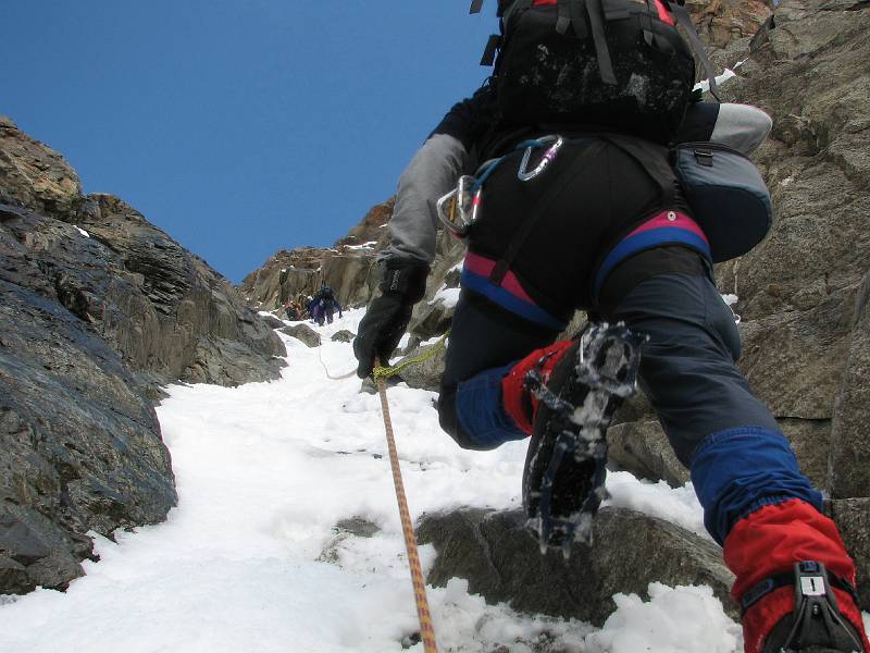 nach dem oberen Gletscherbecken wartete als nächstes Hinderniss die Rinne zur Scharte. Ein schmaler Eisstreifen zog sich durch die Felsen, zwischendrin fanden sich auch noch Passagen mit gutem Trittschnee. Durch die Eisauflage war die ganze Geschichte objektiv sicher und die paar Stellen ohne Eis erlaubten sogar ein paar nete “mixed” Einlagen - alles wieder am Fixseil. Allerdings passte das Gelände überhaupt nicht mehr mit dem zusammen, was ich von den Begehungen vor 20 Jahren in Erinnerung hatte, offensichtlich sind wir damals gar nicht den Grat zur Scharte, sondern direkt zum Gletscher runter.