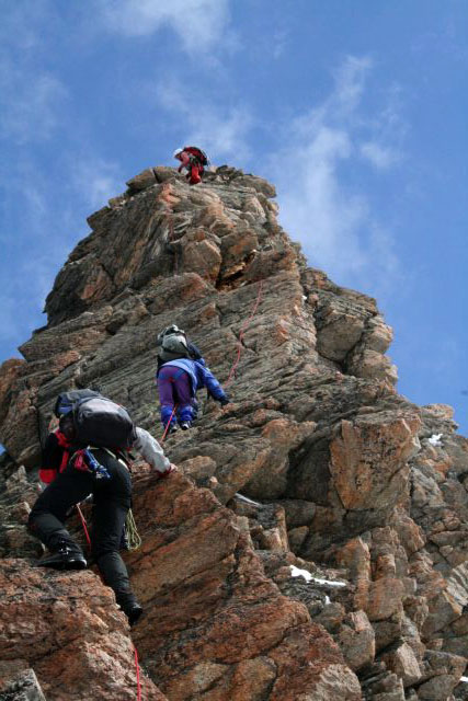 Auf der Scharte empfing uns böiger Wind, und es hatte sich auch schon etwas zugezogen. Dann unterlief mir noch ein führungstechnischer Flop, als ich auf die Mitnahme eines dritten Seiles für den grat verzichtete. Den ersten Steilaufschwung kletterten wir direkt an der Kante, vor dem nächsten Turm erkundete Manni die ostseitige Umgehung. Da mir diese durch viel Quererei und potentielle Steinschlaggefahr bei den folgenden Rinnen führungstaktisch nicht so gut gefiel, versicherte ich dann doch die direkte Kante auf den 2. Gratturm. Ausgesetzte Kletterei an griffigem, schönem Gneiss, gute Sicherungsmöglichkeiten , doch oben eine kleine Überraschung, eine ausgesetzte schneebedeckte Platte hinunter in die Scharte vor dem Gipfel und kein Seil mehr. Michael brachte das untere Seil herauf, währendessen ich schon ein paar Schlingen verlegte. Trotzdem kostete die Aktion Zeit, und auf ein mal sah man im Verwall und Lechtal Regenfäden von den Wolken hängen